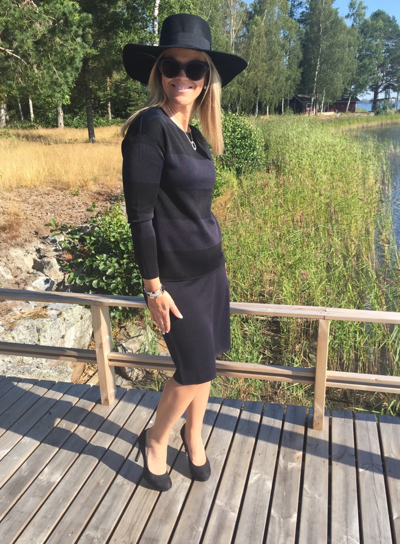 Tässä kuvassa neulesetti näyttää jopa kokomekolta. Hameen mitta on loistava eli hameen helmat pitenevät nyt syksyä kohden. Hame on hieman pyöristetty lantion kohdalta eli se ei ole lantiosta liian tiukka vaan laskeutuu kauniisti.