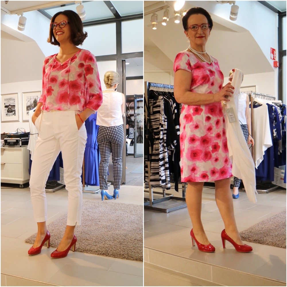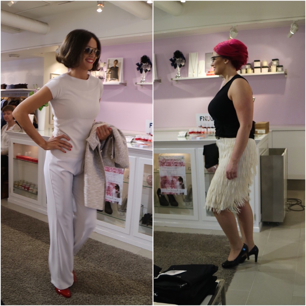 Hei kaikille! Ihana nähdä näin paljon muodista ja kauneudesta kiinnostuneita naisia. Illan muotinäytöksen teema on 60-luku, joka tuleekin hyvin esille Salon Adelaiden tekemissä meikeissä ja kampauksissa. Silmä- ja aurinkolasit ovat Iris Optikolta. Minulla on päälläni Andiatan kukkatoppi, Ouin ruutuhousut ja Gaborin korkkarit.