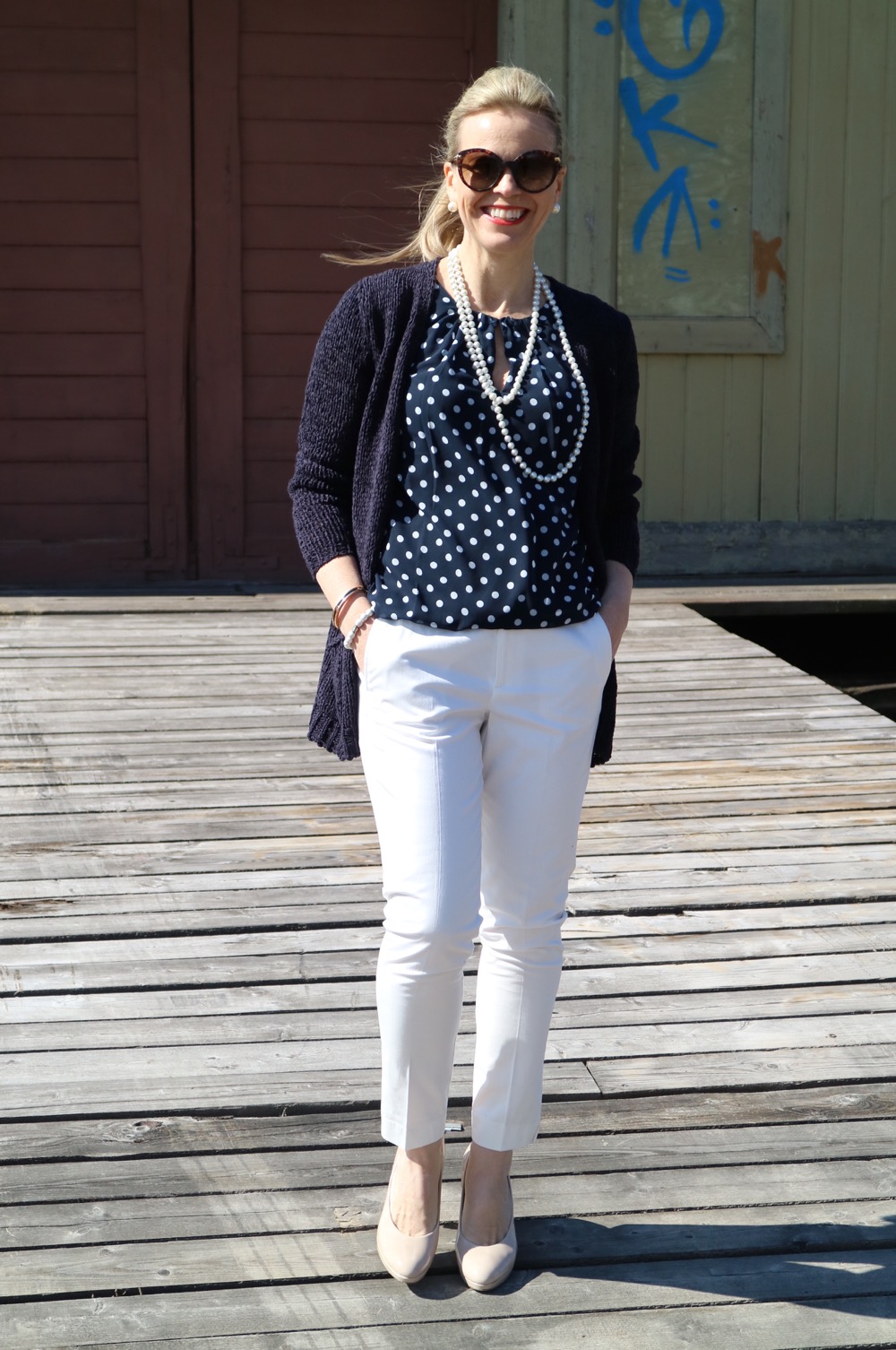 Valkoinen jakku on siisti ja ylellinen. Mutta jos haluat asusta rennomman, niin paksuhko ja laadukas neuletakki, joka pysyy hyvin kuosissaan, sopii myös juhlavimpiin tilaisuuksiin. Neuletakissa on hyvä mitta, se ylettyy juuri pepun alle. Valkoisista housuista sen verran, että muistathan kiinnittää huomiota alusvaatteisiisi, kun käytät valkoisia housuja. Suosittelen ihonvärisiä alushousuja ja ehdottomasti saumattomia, jotta niiden rajat eivät näy valkoisten housujen läpi.