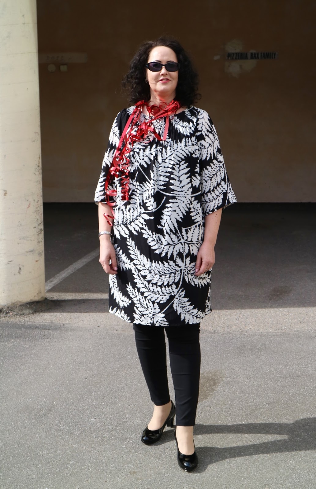 Eija rakastaa mustaa. Ja toinen mistä Eija pitää on housut. Olen yrittänyt Eijalle välillä hametta tai mekkoa, mutta yhden päivän Eija sitä käyttää ja sitten hän siirtyy taas mustiin housuihin. Eija tykästyi mustavalkoiseen mekkoon, jonka alle hän puki mustat tiukat housut.