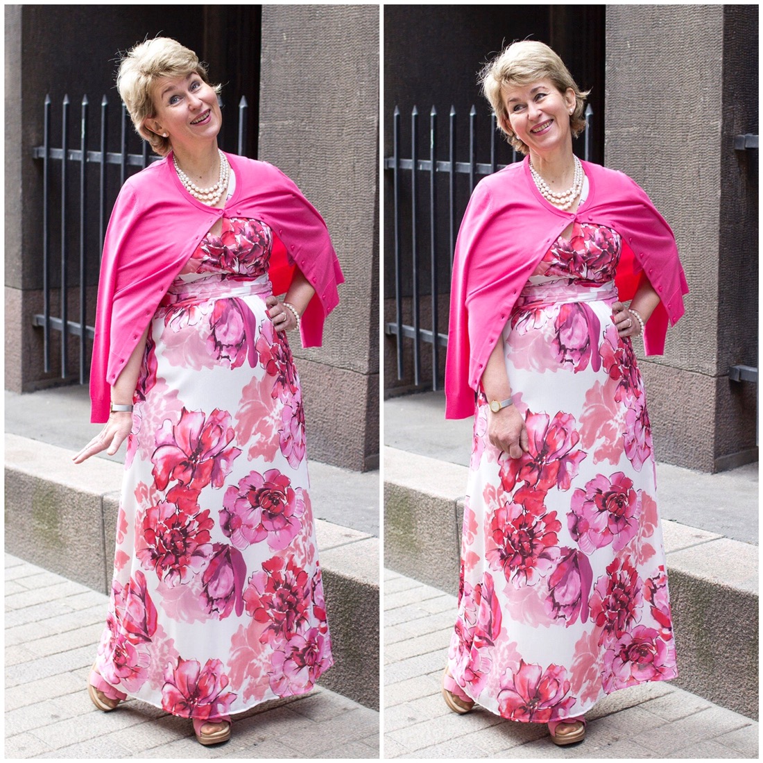 Sää: Koskaan emme tiedä, minkälainen sää tulee olemaan vaikka järjestäisimme juhlat heinäkuussa. Siksi tarvitsemme lämmikettä mukaan eli Sinille puimme pinkin huivin sekä neuletakin, joka ajaa tätä asiaa. Maximekko sopii loistavasti kesän juhlaan. Se peittää sääret ja on todella kätevä suoja hyttysiä vastaan. Maximekko on juhlavampi kuin housut ja maximekolla saa ihanaa juhlafiilistä, sitä on helppo käyttää kesällä, koska silloin ei tarvitse miettiä mikä takki sopisi pitkän mekon kanssa.