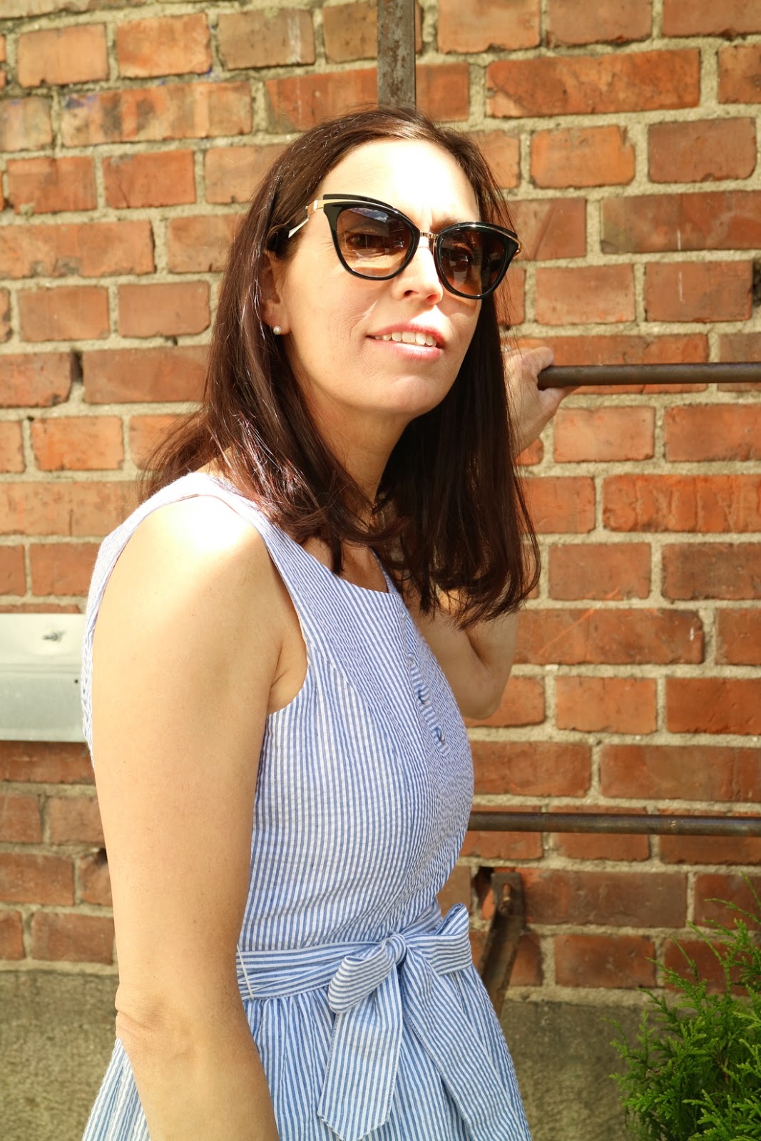Tämän mekon valinnasssa tiesin, että se olisi Miialle mieluinen. Se on rento sekä tyttömäinen. Mekot, joissa on kellomainen alaosa tekee mekosta tyttömäisen ja vuorostaan kapea alaosa tekee mekosta naisellisen. Mekossa on klassinen sinivalkoinen raitakuosi, johon on saatu elävyyttä yhdistelemällä kangasta erisuuntaisesti. Edessä on paikkataskut ja vyötäröllä on vyö. Sidoin rusetin eteen, mutta sen voi sitoa myös taakse. Juuri tällaisen mekon päälle neuletakin voi pukea harteille. Koko asu henkii vanhanaikaista kesätunnelmaa, eritoten jos kuva olisi mustavalkoinen.
