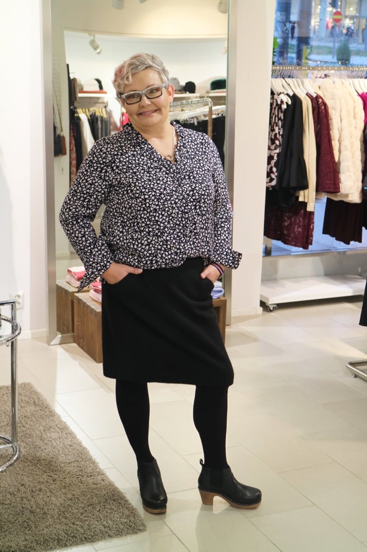 Huomaatko, että vaikka laitoimme kuviollisen paidan yläosaksi ja mustan kapean hameen alaosaksi, pysyi kokonaisuus silti tasapainoisena! Mistä se johtuu? Se johtuu oikean kokoisista vaatteista ja siitä, että vaatteiden mittasuhteet ovat Susannille oikeat. Hameessa ei myöskään kapeat reidet tule esille, kuten kapeissa mustissa housuissa. Hame tasapainottaa vartalon alaosaa. Ja mikä parasta, paita ei lepata suorana hameen päällä kun puimme sen hameen sisälle.