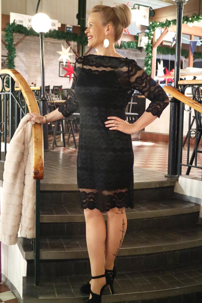 Päälläni olevassa pitsimekossa on veneenmallinen kaula-aukko. Se nousee keskeltä kaulan alareunaan ja jatkuu pidemmälle hartialinjaa kohden. Mekossa on irrallinen vuorimekko. Vuorimekon olkaimia voi itse säädellä eli sen saa pidemmäksi, jotta se ylettyy alemman pitsikaistaleen kohdalle. Silloin ihoa ei näy välistä ja mekko soveltuu paremmin virallisempiin tilaisuuksiin. Päälläni oleva pitsimekko on musta, mutta sitä löytyy myös tummansinisenä.