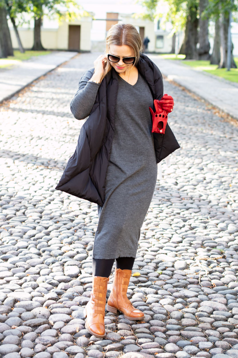 Minulla on jalassani Pandora saappaat. Nämä ovat nahkaa ja konjakin sävy näissä saappaissa on upea. Edessä olevat kuminauhalenksut ovat koriste, sisäsaumassa on vetoketju. Saappaissa on tilava kärki ja pieni korko. Minun jalkani pitävät saappaiden etukärjestä leveytensä ansiosta. Olen tänä syksynä kärsinyt orastavista vaivasenluistani pitkästä aikaa, joten arvostan tilavia kenkiä. Pidän midimekon ja näiden saappaiden kombosta. Kummatkin näyttävät uudennäköisiltä.