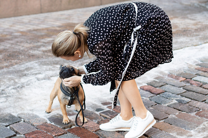 Mustapohjaisessa kietaisumekossa jätin hakaneulan pois miehustasta ja puin mekon alle pitsitopin. Annoin yläosan ”repsottaa” ja pidin tästäkin tyylistä. Mekko on rennompi ja ”coolimpi” kuin hakaneulalla. Rosa pitsitoppi on samanvärinen kuin mekossa olevat rosat pilkut.