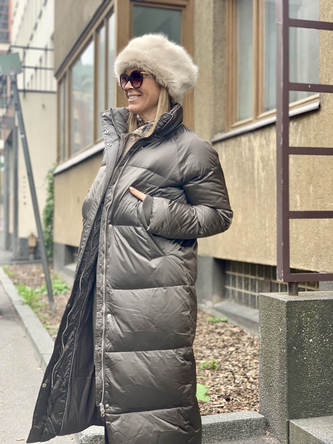 Nyt tässä on sama untuvatakki upean hohtavan nutrian sävyisenä. Takin ei aina tarvitse olla musta.