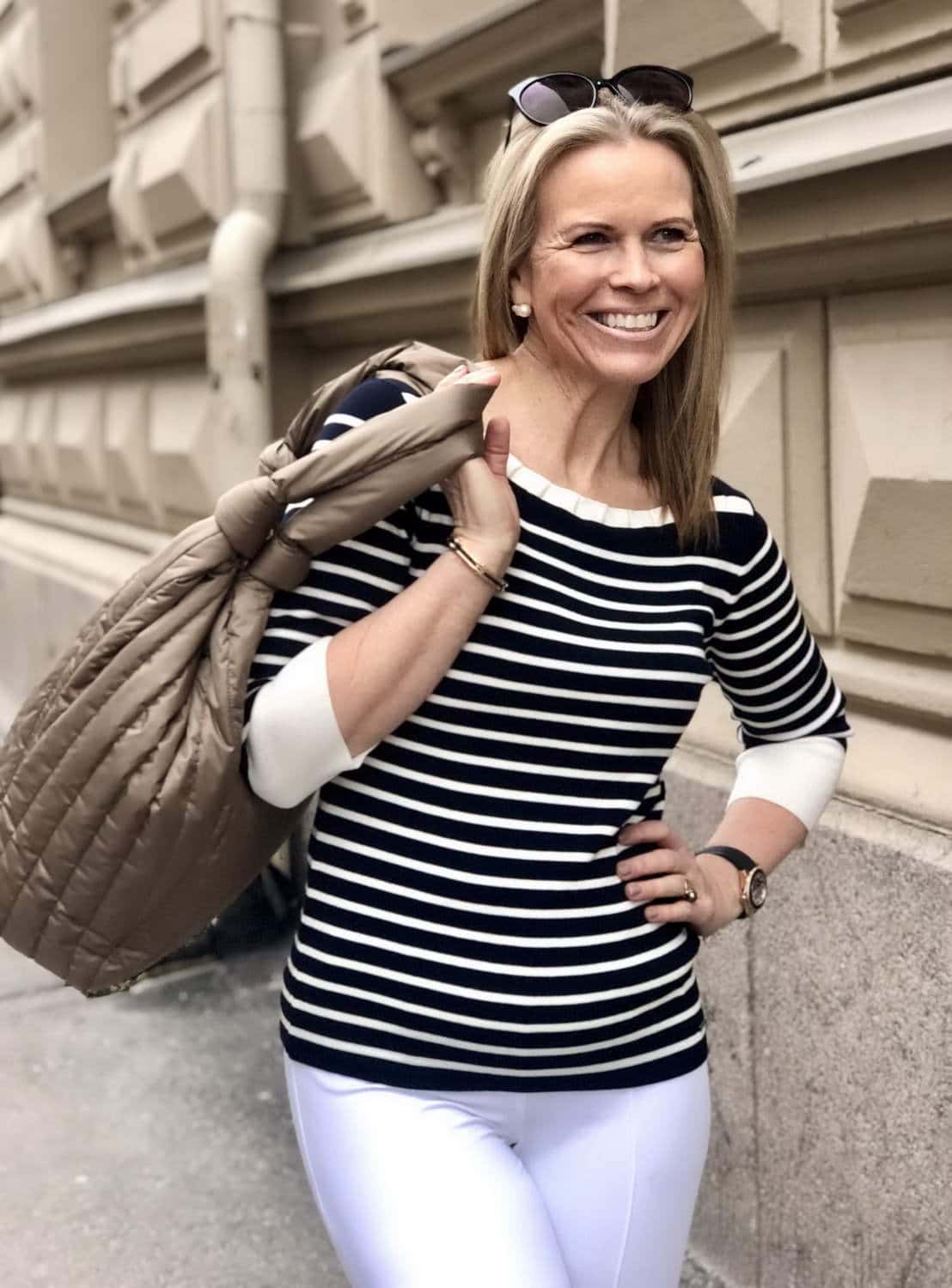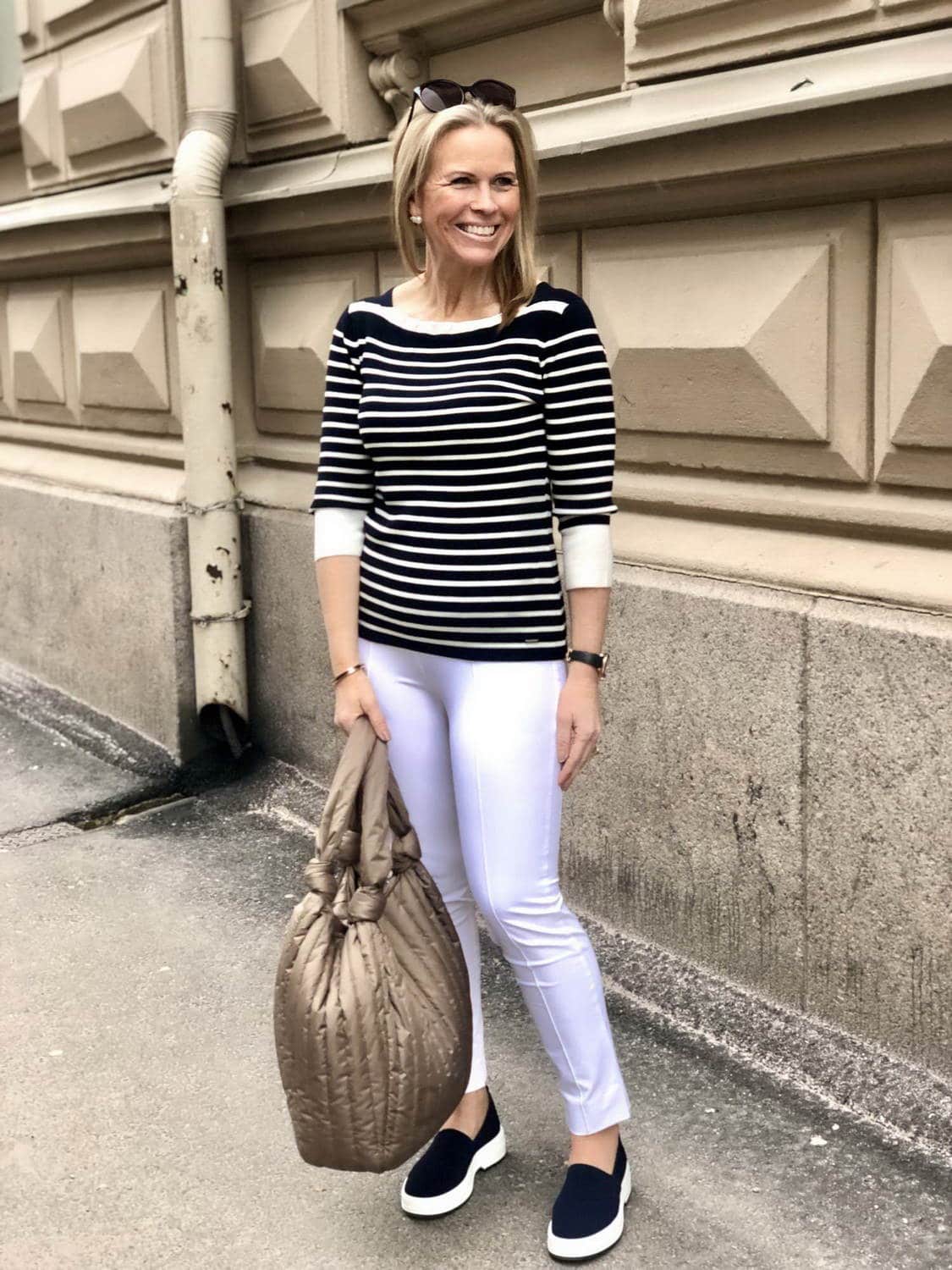 Sinivalkoinen raitaneule ja tummansiniset kangas loaferit valkoisten housujen kanssa ovat täydellisen yhteensopiva pari. Tällä asulla lähtisin mielelläni kesäloman viettoon. Lähtisitkö sinä?