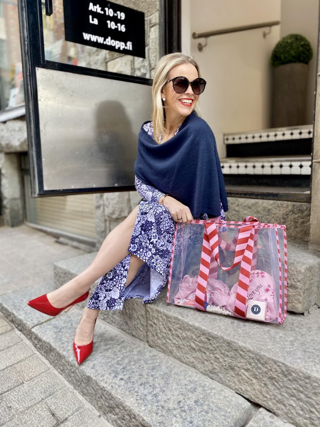 Kassi sisältää Doppwoman helmikorvakorut sekä helmikaulanauhan, käsirasvaa, rosan silkkihuivin, Geisha suklaata ja tottakai koko läpinäkyvän kassin puna/rosa raitaisilla kantokahvoilla.