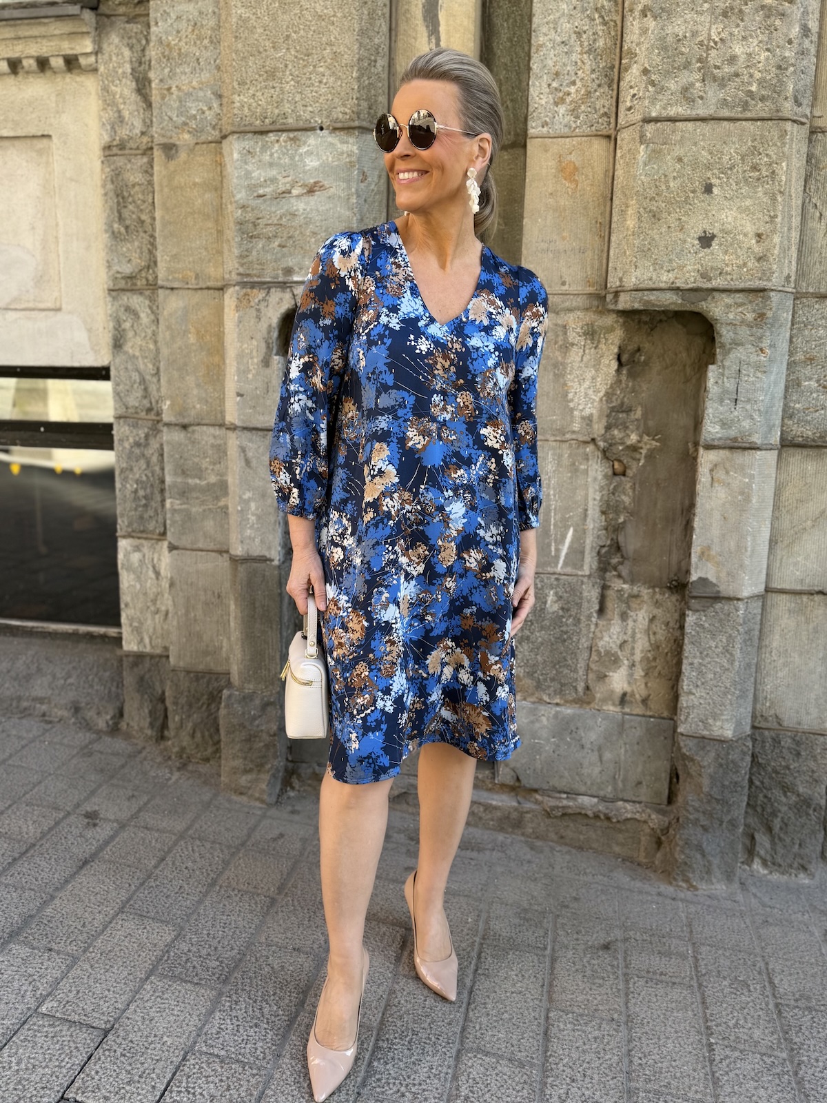 Salla mekossa on pitkät hihat, V-kaula-aukko ja malliltaan mekko on aavistuksen alaspäin levenevä. Kun katsoo rinnan ja lantion mittoja, eivät ne paljoa poikkea keskenään. Mekossa on napit edessä, taskut ja mekko ylettyy itselläni (koko 34) polveen.