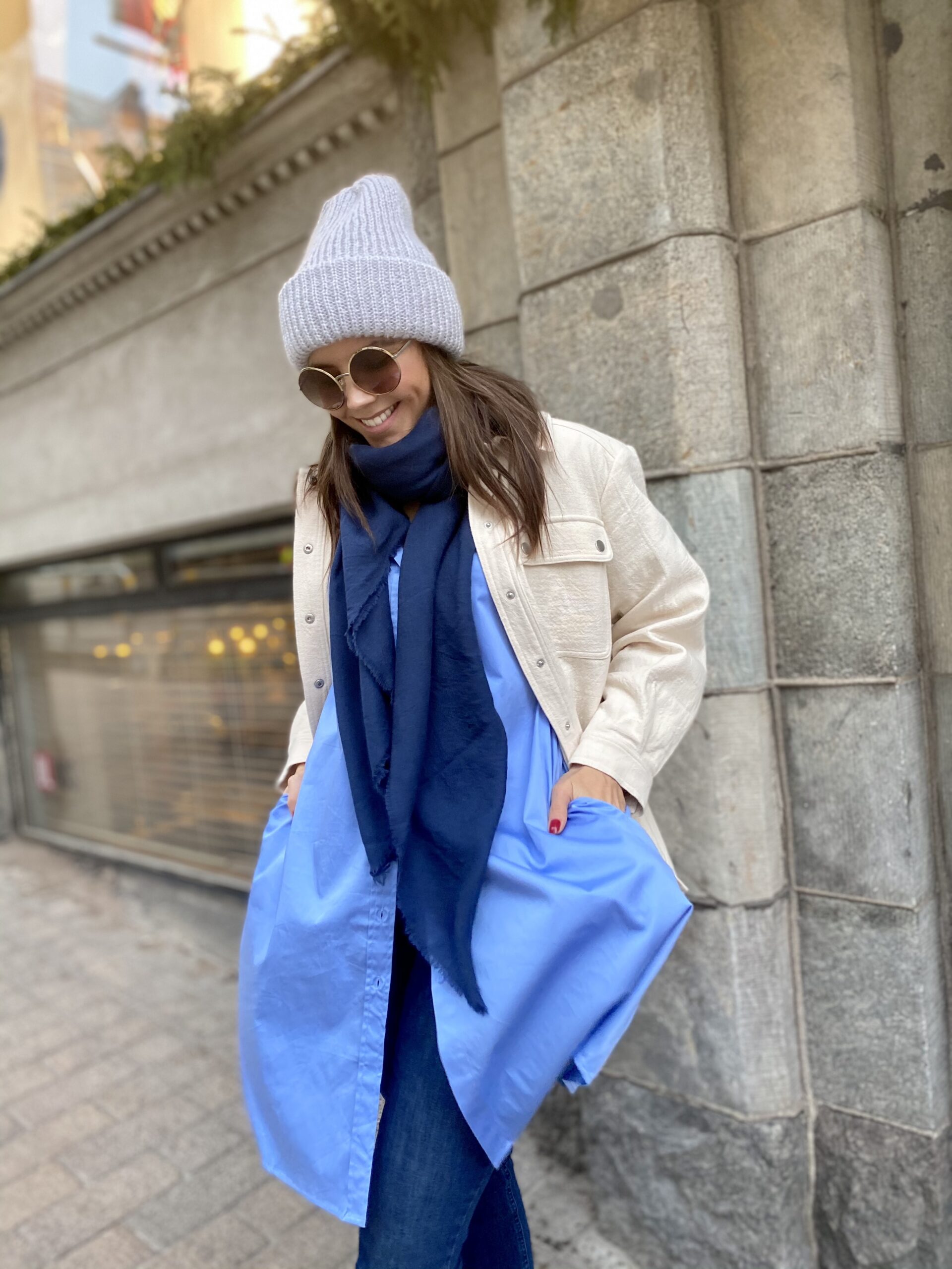 Gabi puki A-linjaisen takkimekon alle Dream skinnyt tummalla pesulla. Kaulaan hän kietaisi tummansinisen 100% villahuivin ja mekon päälle hän puki luonnonvalkoisen Gale vaarinpaidan. Kylmän sävyinen siniharmaa Doris pipo sopii asuun kauniisti ja jalkaansa Gabi valitsi Haylie gore-tex nilkkurit, joita hän tykkää käyttää kun lenkkeilee Jade koiran kanssa.