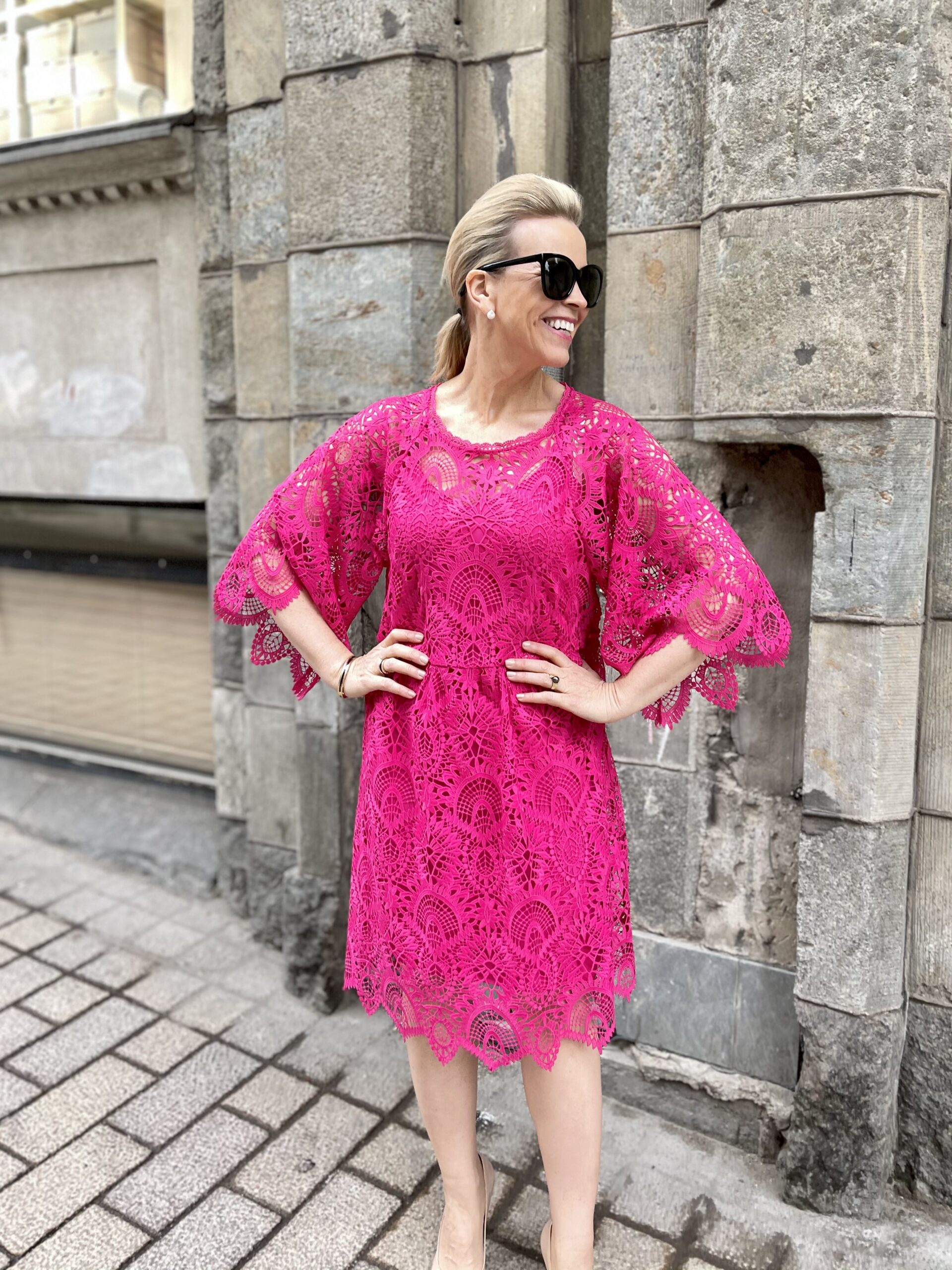 Tämän postauksen yhteinen tekijä on pinkki väri. Pinkit housut eri yläosilla ja pitsinen pinkki mekko säväyttävät ja antavat erityylisiä asukokonaisuus mahdollisuuksia niin housu- kuin mekkonaisellekin.
