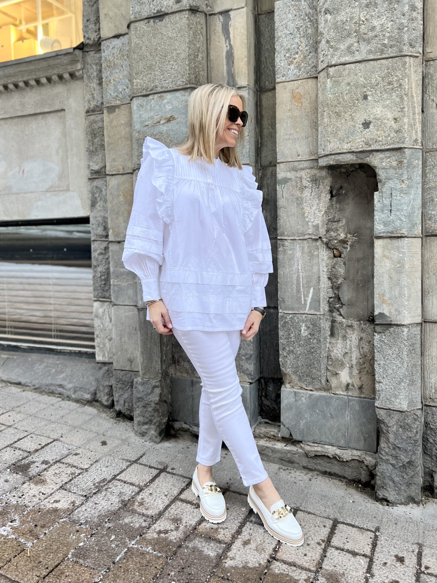 Valkoiset loaferit kultaketjulla ovat super kauniit! Loaferit ovat kevyet ja ihanan tuntuiset jalkaan. Niissä on valkoinen kumipohja ja reunaa sekä pohjaa kiertää beige kaunis kantti. Loaferit vastaavat normaalia kokoa. Minulla on loafereista koko 5/38, kuten minulla normaalistikin on. Koossa 5/38 sisäpohjan pituus on 25 cm.