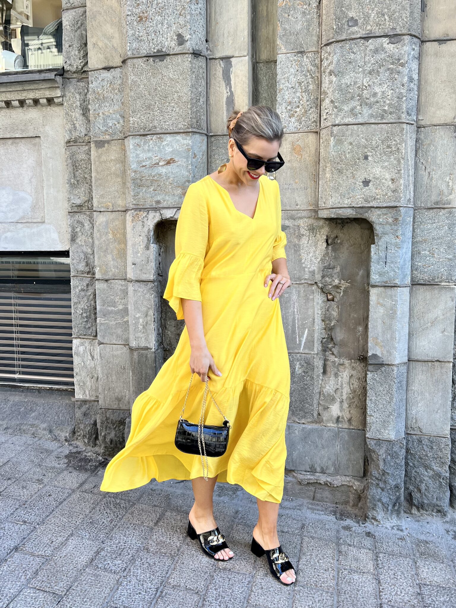 Vagga mekossa on super kaunis malli, joka imartelee vartaloa! Mekossa on V-kaula-aukko, joka ei ole liian syvä. Mekossa on puolipitkät hihat ja hihansuissa on frillakantti. Vyötärön kapeimmalla kohdalla on poikkileikkaus ja helmaosassa, hieman polven yläpuolelta lähtee yksi salsakantti. Mekko laskeutuu kauniisti ja siinä on vuori. Mekon takana on vetoketju ja mekko istuu kauniisti myös selästä. Mekko on aavistuksen pidempi takaa kuin edestä. Gabilla on päällä koko 38 (mekko on löysähkö, myös koko 36 sopisi hänelle).