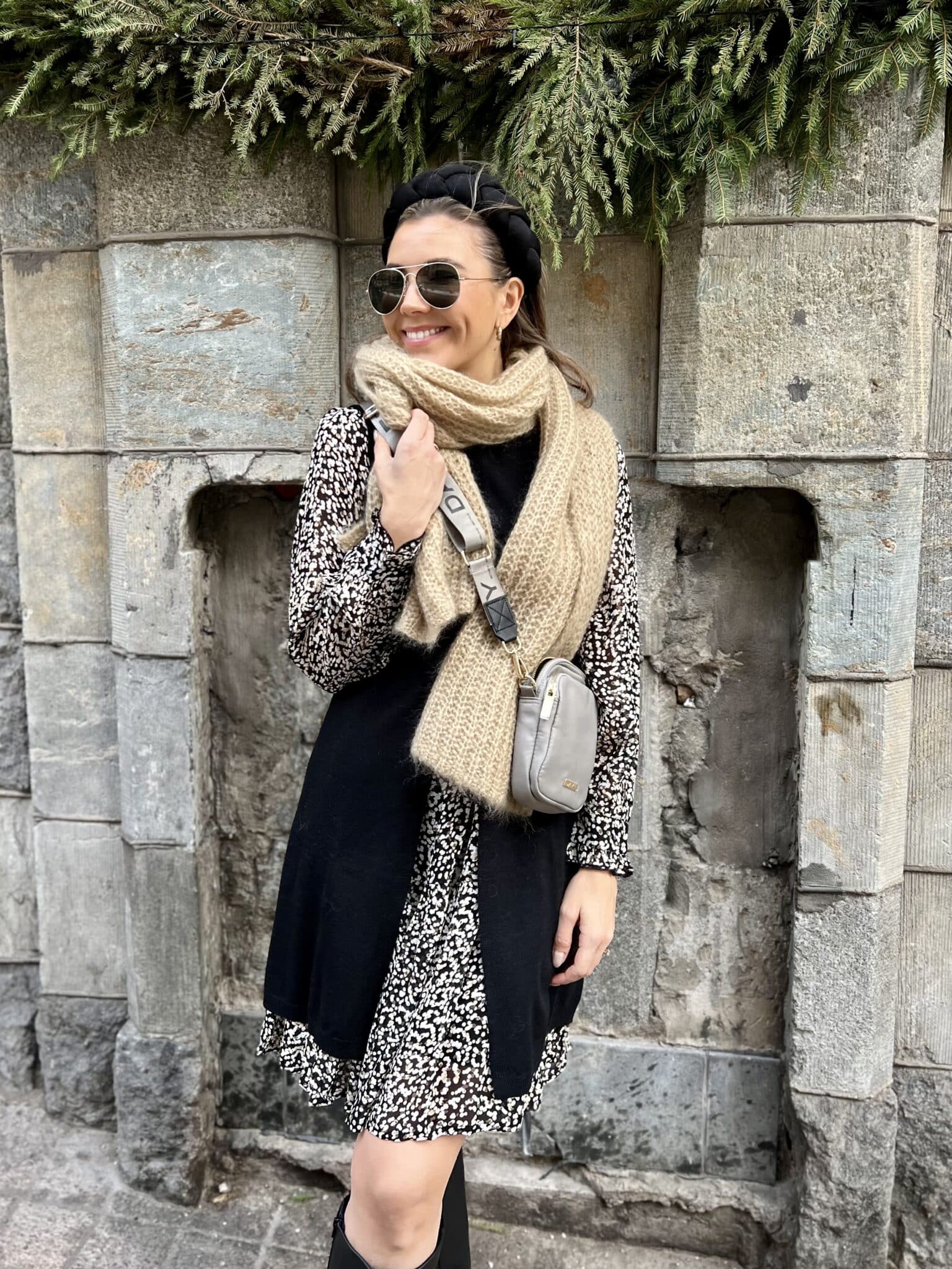 Samaan värimaailmaan seepra vekkarin kanssa kuuluu Veni kuosimekko. Nämä kevyet viskoosi kuosimekot ovat aina suosittuja kauniiden kuosien ja monikäyttöisyyden johdosta. Näitä mekkoja voi käyttää kesät talvet ja ne sopivat moniin eri tilaisuuksiin. Nämä on myös helppo pakata mukaan reissuun. Tällaisen mekon voi pukea esimerkiksi päiväasuksi kaupunkilomalla ja ilta-asuksi rantalomalla. Puimme Veni kuosimekon päälle Doppwoman mallistomme mustan merinovillaisen Bonita liivin. Bonita liivi on todella pukeva ja se sopii kauniisti mekkojen päälle ja toki myös erilaisten paitojen ja housujen kanssa. Bonita liiviä löytyy tämä musta sekä beige ja tummansininen. Tummansininen on uusi väri tähän tuoteperheeseen ja sen kuvaamme verkkokauppaamme ensi viikolla. Liikkestä se jo löytyy. Iso muhkea huivi, olan yli puettava Mini laukku ja mustat saappaat kruunaavat Gabin lookin.