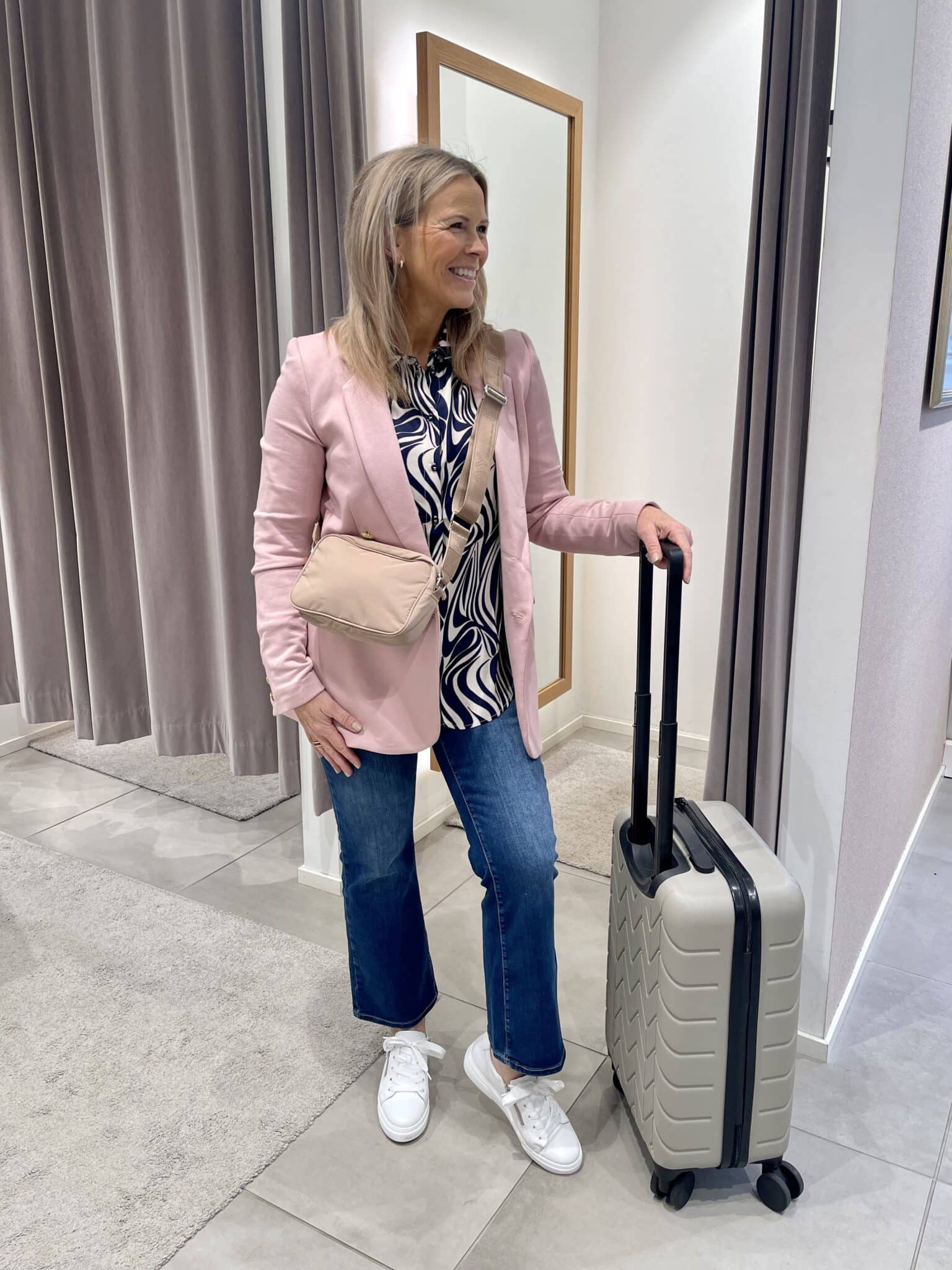 Farkut, paitis ja ihanan pehmoinen jersey jakku. Jalassa super kevyet valkoiset tennarit joilla menee koko reissun. Ne sopivat niin housujen kuin mekkojenkin kanssa. Olan yli oleva laukku on ”must have” eli kätevä jossa pysyy tärkeimmät tavarat tallessa.