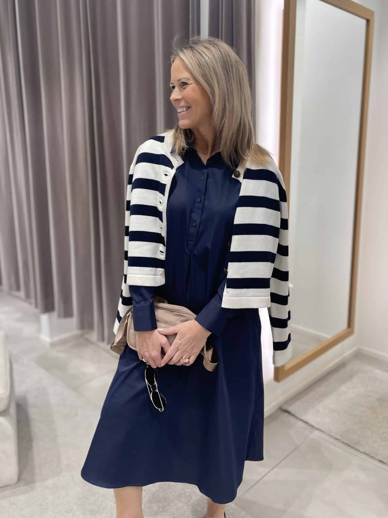 Tummansininen paitamekko ja ballerinat. Harteille puetaan neuletakki, jonka voi pukea päälle, jos illalla tulee vilu. Thaimaassa ei neuletakkia tarvitse illalla ottaa mukaan, mutta jos lähtee Espanjaan tai Kanarialle, niin se kannattaa illalla ottaa mukaan kun lähtee syömään. Päivälaukku toimii rentona iltalaukkuna, kun sitä kantaa kädessä.