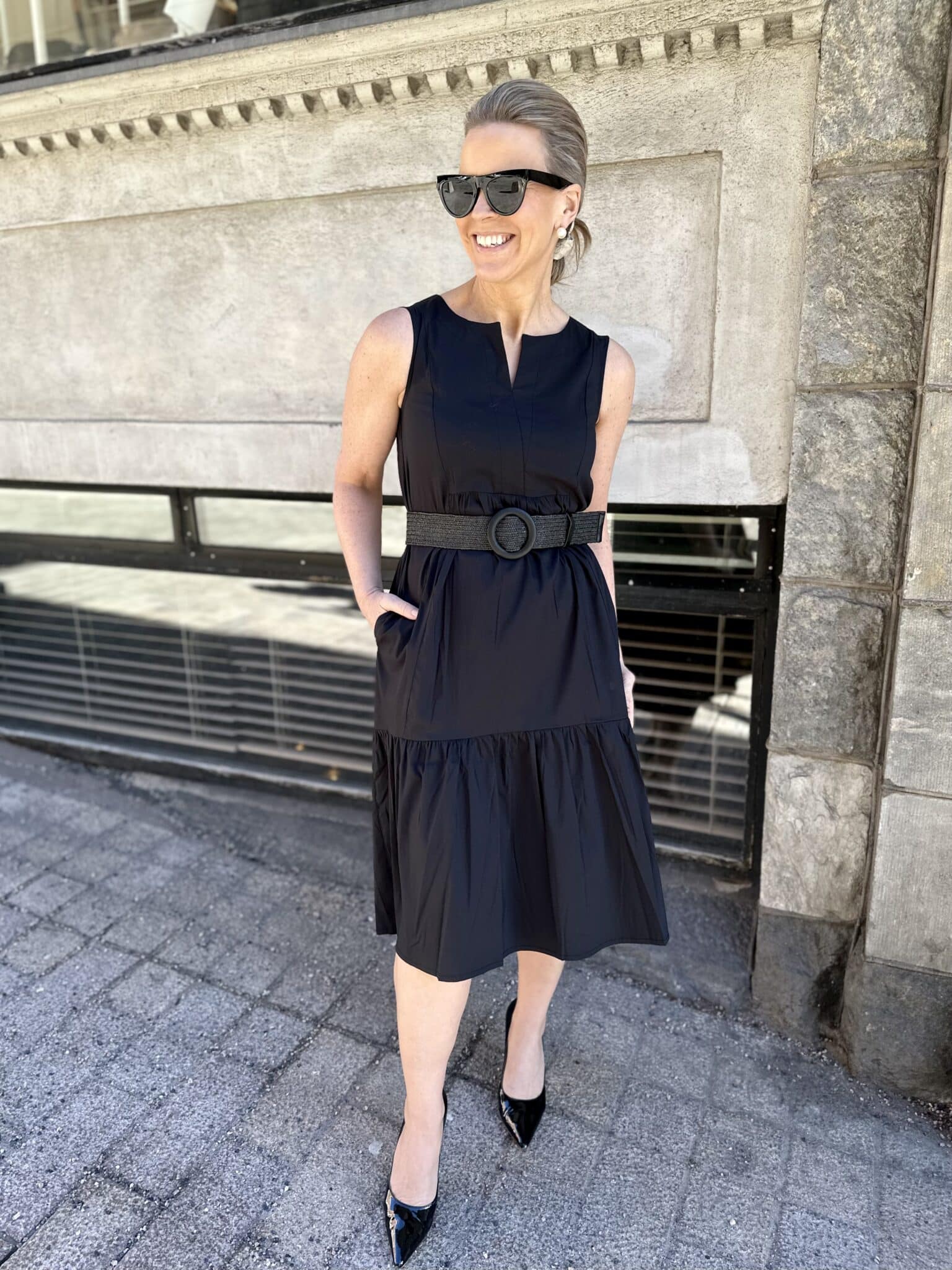 Ilona mekkoa löytyy myös mustana. Puin vyötärölle mustan korivyön mustalla soljella ja mekon luonne muuttui työstetymmäksi. Tähän asuun voi yhdistää beigen tai mustan toppakeppin.