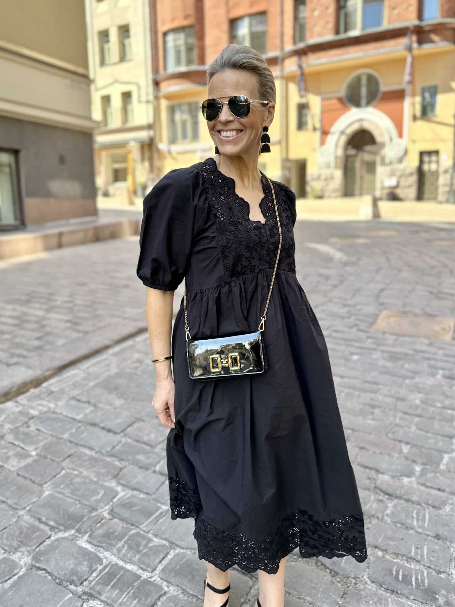 Eräs asiakas haki asukokonaisuuksia viiden päivän työreissulle. Päivisin hänen tuli käyttää yrityksen logopaitaa, joihin katsoimme hänelle mustat Adian housut. Tämän lisäksi hän tarvitsi 5 ilta-asua. Löysimme hänelle muutamia paitoja mitkä hän pystyi yhdistämään mustiin päivähousuihin, valkoisen jakun muutamalla topilla ja muutaman mekon. Puimme jokaiseen asuun tämän mustan Asta laukun ja se oli juuri se puuttuva palanen asuihin. Pelkällä laukulla hän kruunasi asut astetta juhlavimmiksi joka ilta. Mukaan hän otti mustat kauniit avokkaat.