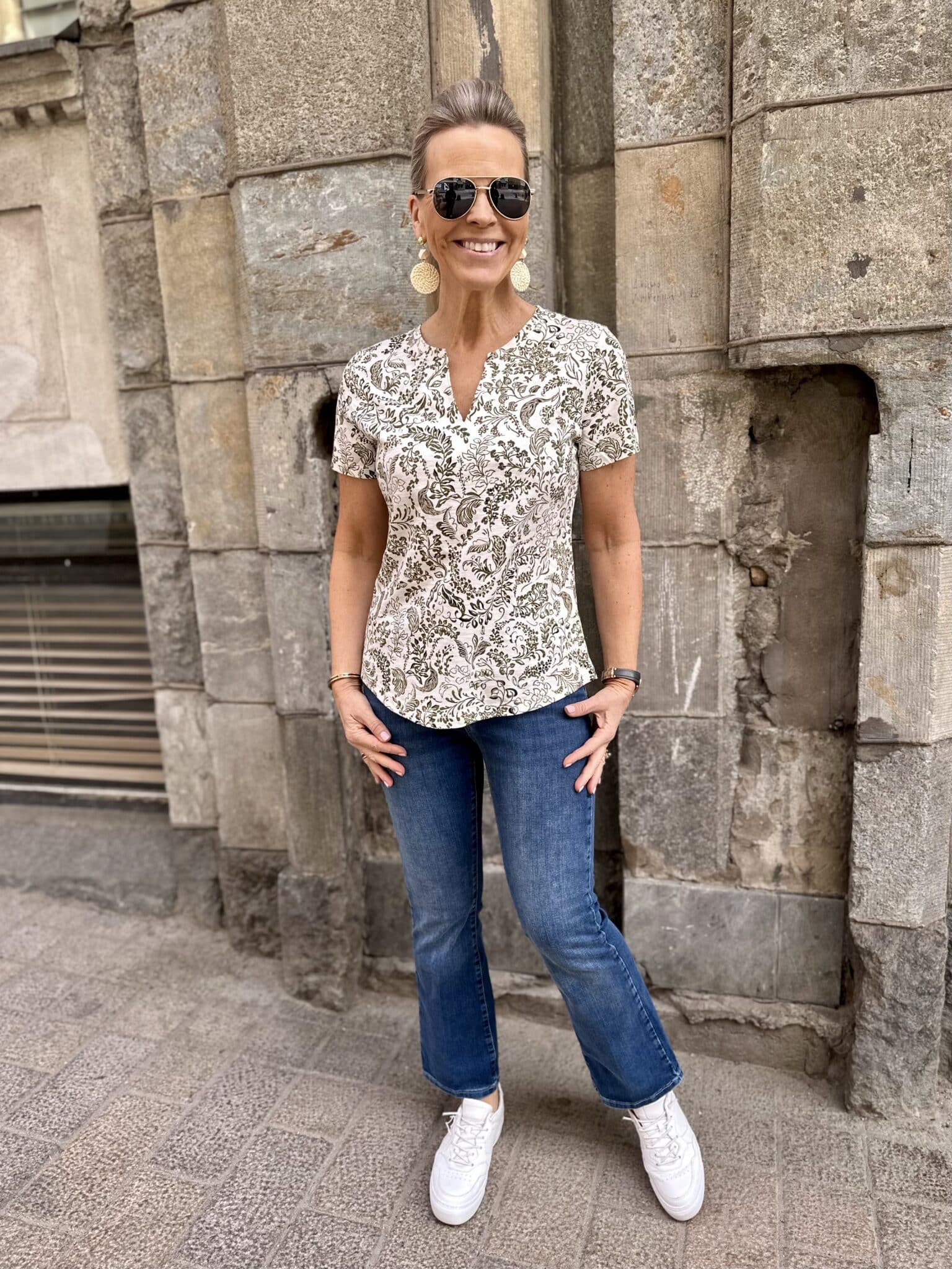 Gesinas t-paita on kaunis ja tyylikäs t-paita monenlaisten alaosien kaveriksi. T-paidassa on O-kaula-aukko, jossa on halkio edessä. T-paidassa on pienet hihat. Se ylettyy lantiolle ja sen helma on kauniisti pyöristetty. Pyöristetty helma luo illuusion kapeammasta vyötäröstä. Minulla on t-paidasta päällä koko S.