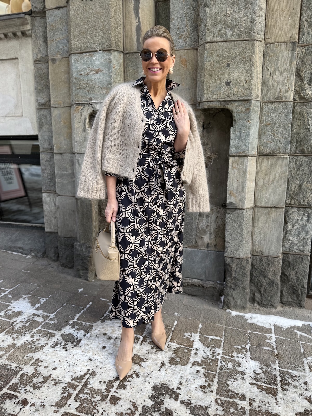 Kolmas nahkahameen väri on beige. Tämä nahkahame toimii myös talvella. Monesti mietitään, voiko beigeen hameeseen yhdistää syksyllä ja talvella mustat paksut sukkahousut ja vastaukseni on että kyllä voi. Yläosaksi tällöin suosittelen myös mustaa väriä tai vaaleaa, hameen sävyistä yläosaa. Mutta myös tällainen kirjava yläosa, mistä löytyy vaaleaa ja tummaa, toimii. Tällöin asukokonaisuus säilyy tyylikkäänä.