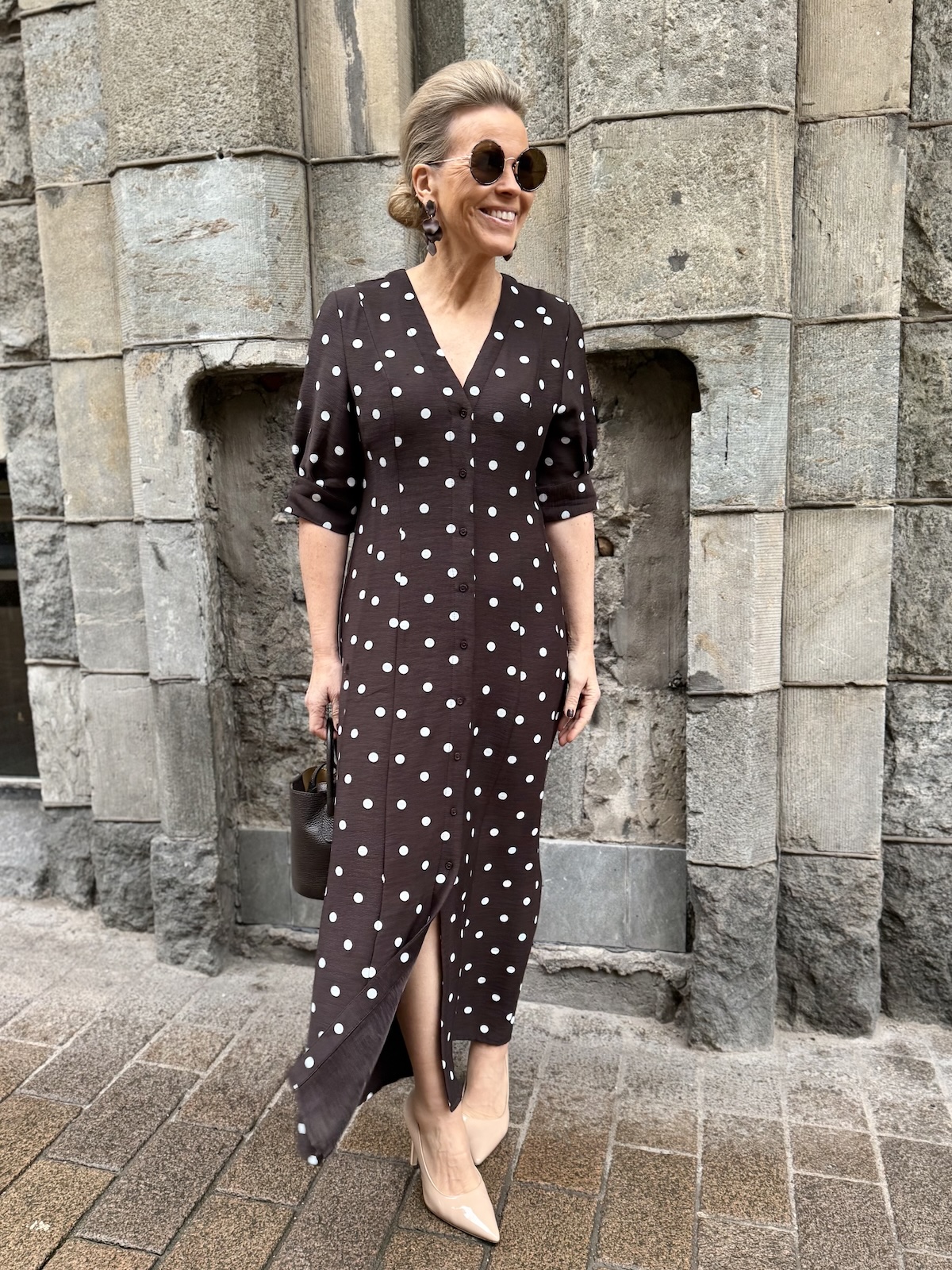 Olen stailannut Cadilyn midimekon viidellä eri tavalla. Muutokset ovat pieniä, mutta huomattavia. Näissä kahdessa ensimmäisessä kuvassa kietaisin mekkoon kuuluvan vyön vyötärölle. Vyö tulee pukea vyötärön kapeimpaan kohtaan.