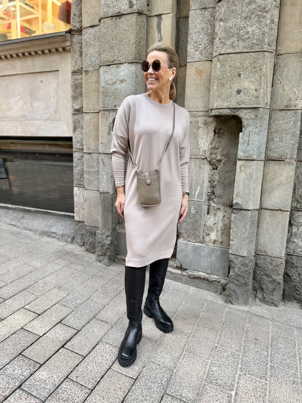 Olivio neule on ihana päällä, se on pehmoinen ja joustava. Neuleessa on O-kaula-aukko ja pitkät hihat. Hihat ovat jopa hieman ”ylipitkät”, mutta se ei haittaa. Hihoja voi hieman vedellä ryppyyn käsivarsien kohdalle. Neule on kauniisti slimmattu vyötärön kohdasta ja lantion kohdasta neule levenee alaspäin ja loppuu noin lantiolle. Minulla on neuleesta päällä koko S.