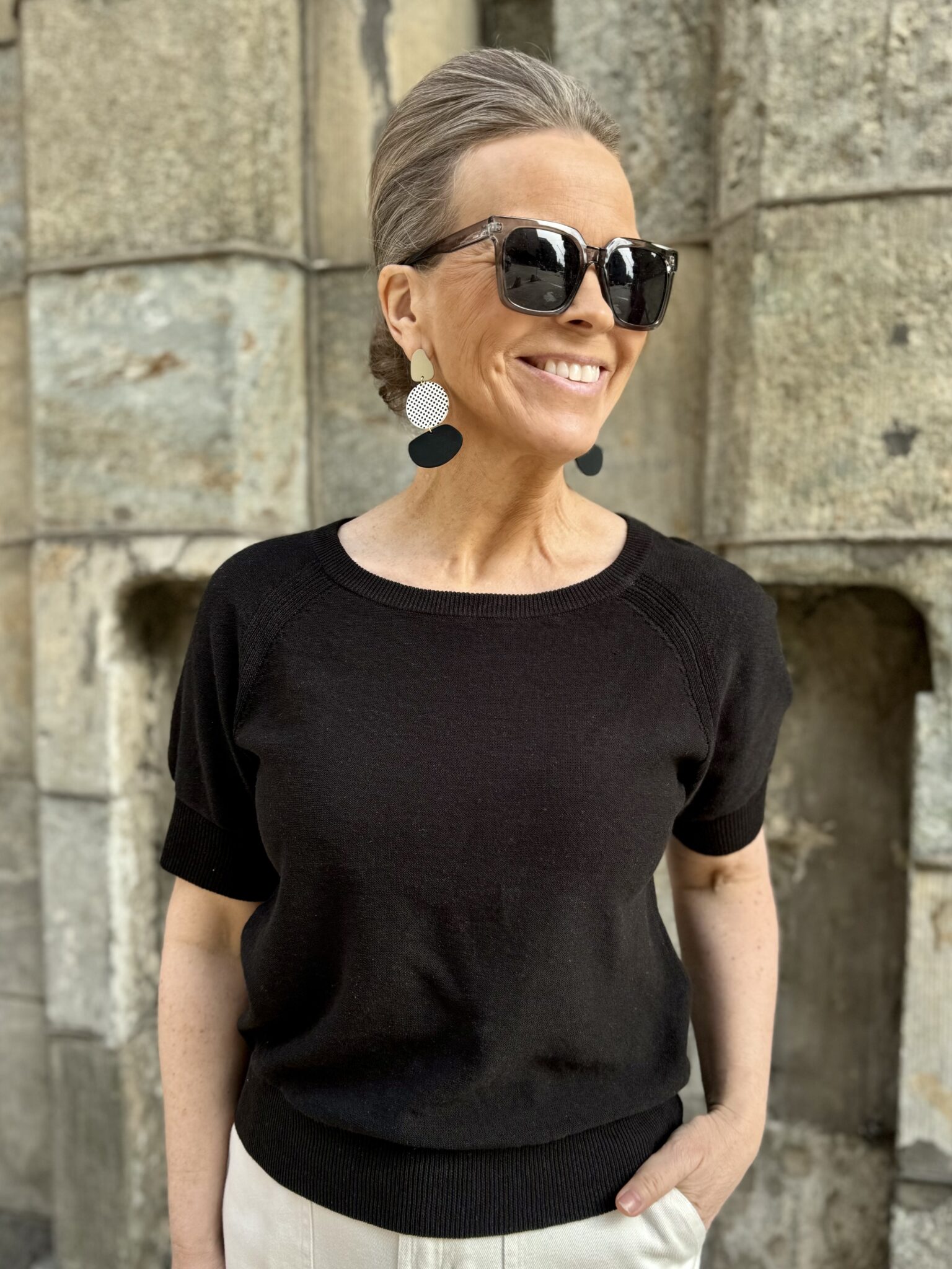 Glennie on tyylikäs, lyhythihainen neule. Neuleessa on O-kaula-aukko ja ragla hihat, jotka ylettyvät kyynerpäiden yläpuolelle ja hihansuissa on resorit. Neuleen helmassa on myös resori. Malliltaan neule on suora. Minulla on neuleesta päällä koko S. Neule vastaa normaalia kokoa.
