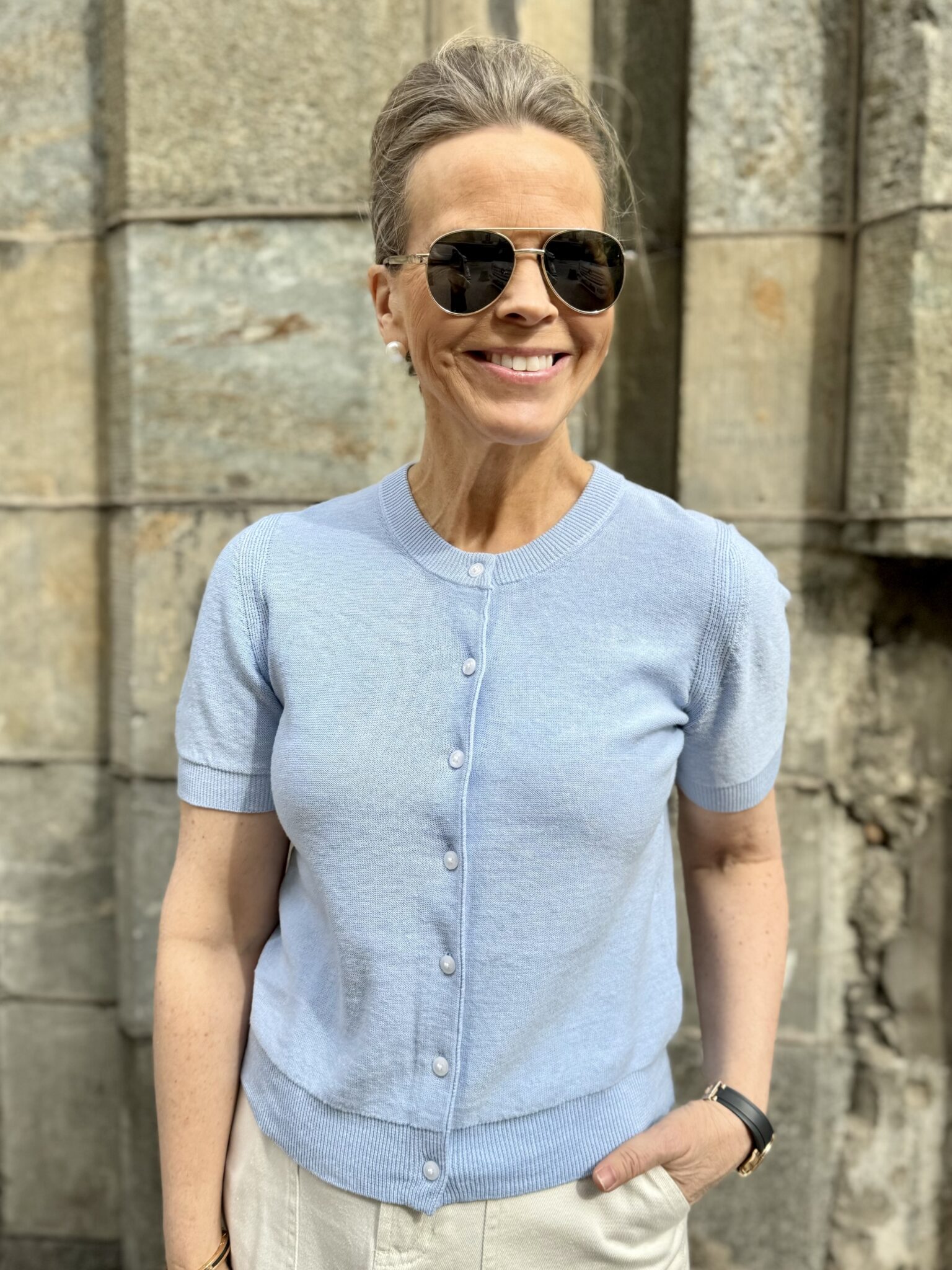 Innostuimme katsomaan vanhoja valokuvia, kun lapset olivat sunnuntaina meillä lounaalla. Inspis siihen tuli, kun siivosin aamulla kaappeja missä oli iso kasa albumeja meidän elämän varrelta. Siellä oli kuva tai montakin kuvaa, missä olimme meidän ”kolmosten” kanssa mm. Muumimaassa. Elettiin siis 90-luvun puoliväliä eli noin 30-vuotta sitten. Ja kuvissa minulla oli päällä siniset legginsit, missä oli valkoisia pieniä palloja, valkoinen tiukka toppi ja vaaleansininen farkkupaita auki siinä päällä, punainen vyölaukku (kätevä lasten kanssa) ja valkoiset loaferit jalassa. OMG, se oli ysäriä. Kun Gabi näki kuvan, niin hän tuumasi, että ”ounou, tässäkin sulla on farkkupaita” ja minulla oli sunnuntaina päällä myös farkkupaita 🙂 Olen siis farkkupaitafani!