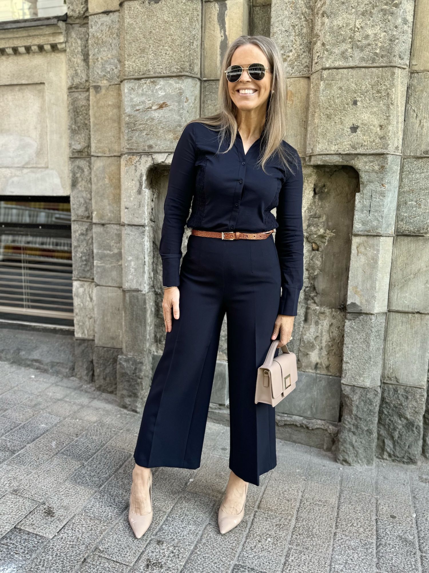 Tässä kuvassa minulla on Wilma kauluspaita ja Carrie culottes housut. Puin päälleni samaa väriä, jotta ero kahden stailauksen erossa näkyy selvästi. Puin Wilma paitiksen culottes housujen sisälle. Housuissa ei ole vyölenkkejä, mutta koska housut nousevat hyvin vyötärölle ja istuvat kuin valettu, voi vyötärölle, housujen päälle pukea vyön. Suosin yleensä tummansinsen asun kanssa ruskeaa tai konjakin väristä vyötä. Tämä sama asia koskee farkkuja. Joskus poikkeustilanteissa voin pukea farkkujen kanssa myös mustan vyön. Tämä on esimerkiksi silloin kun puen yläosaksi mustan paidan. Musta vyö on myös huomaamattomampi vyönä varsinkin tummien alaosien kanssa ja jos solki on vaikkapa kaunis kullanvärinen solki, tulee se upeasti esille.