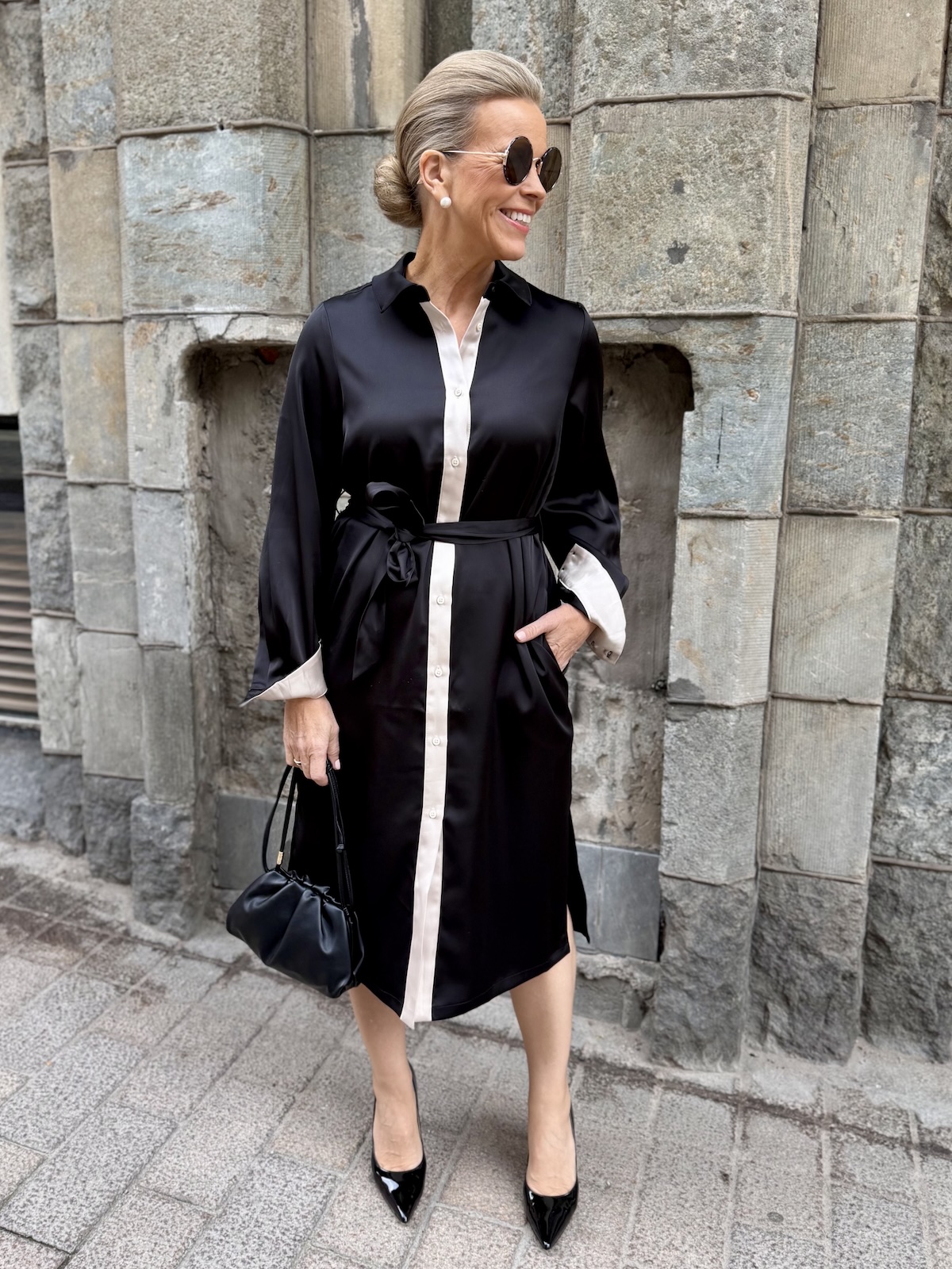 Kuvassa ja videolla on mekosta päällä koko XS (mallikappale), mutta oikea kokoni mekosta on S koko. Tästä kuvasta näkee loistavasti mekon mallin, kuinka V-kirjain on käännetty ylösalaisin. Myös söpöt päällystetyt napit näkyvät kuvassa.