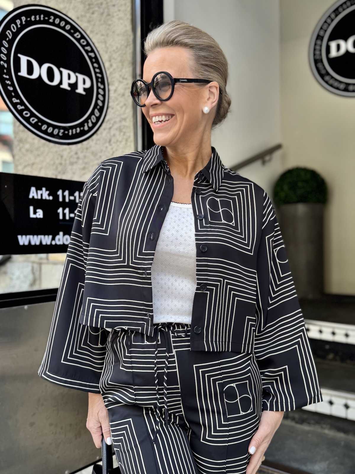 Jos ei halua pukea Topaz sarjan paitaa ja housuja yhteen, niin niistä saa näyttäviä asuja myös siten, että yhdistää housuihin yksivärisen yläosan tai toisinpäin. Paitajakku toimii läpi vuoden esim. mustan hameen ja housujen yläosana. Paitajakun alle voi aina pukea topin tai poolon keskellä talvea. Myös mustan tai beigen mekon päällä paitajakku toimii oikeinkin tyylikkäästi.