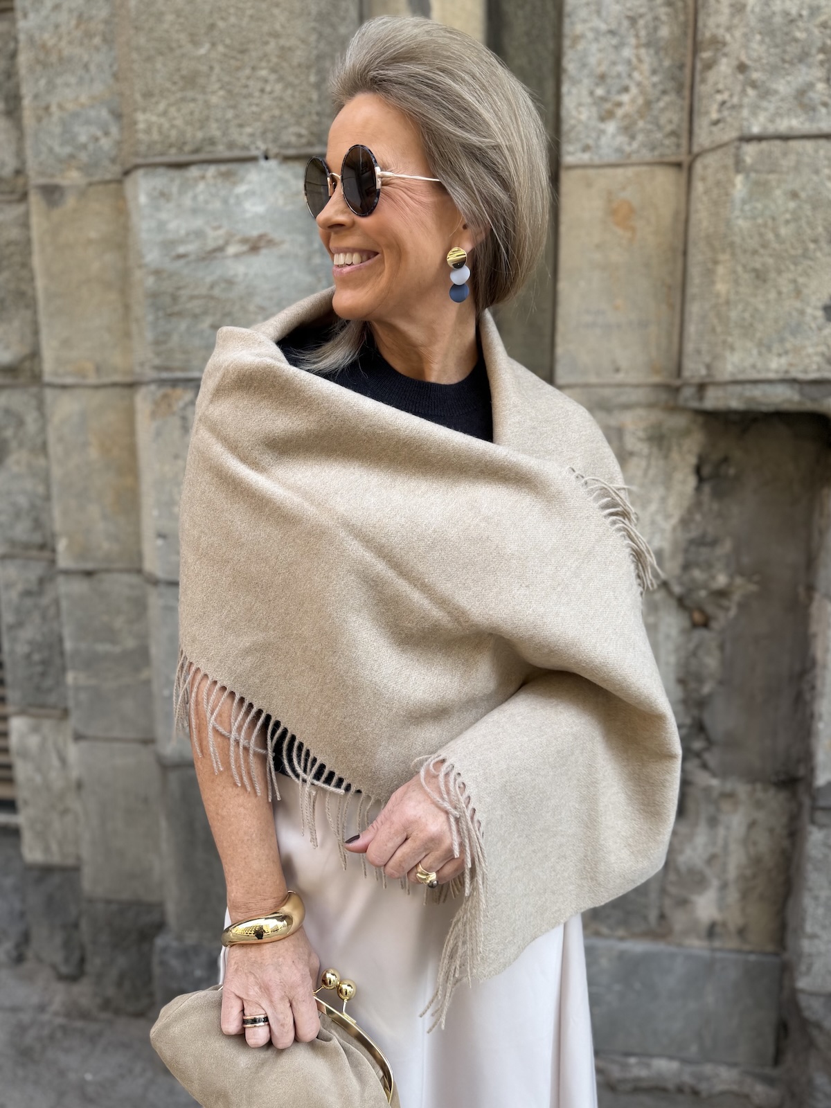 Ensimmäisessä kuvassa minulla on ihastuttava 100% villahuivi harteillani. Huivi on hauska, koska siinä on hapsut kummallakin sivulla. Huivi toimii harteilla ja kaulassa ja huivia löytyy myös kaunis beige sävy, joka löytyy tästä seuraavasta kuvasta.
