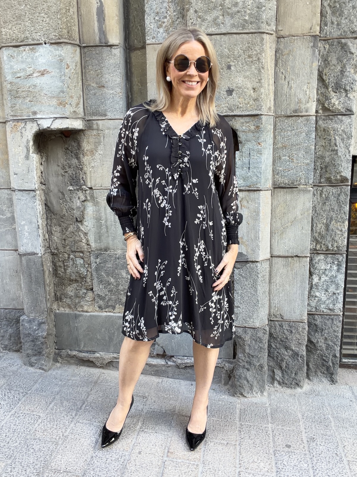 Urma mekossa on kaunis malli ja kaunis kangas. Kangas on pohjaväriltään musta ja siinä vaaleita kukkia joissa on hieman punaruskeaa. Mekossa on V-kaula-aukko ja kaula-aukon reunaa kiertää kapea fyrrykantti. Edessä on muutamia musta/kullanvärisiä pieniä nappeja. Hihat ovat vuorettomat ja hinansuissa on kumilankarannekkeet. Mekko on malliltaan suorahko ja se laskeutuu kauniisti noin polvien kohdalle. Minulla on mekosta päällä koko 34.