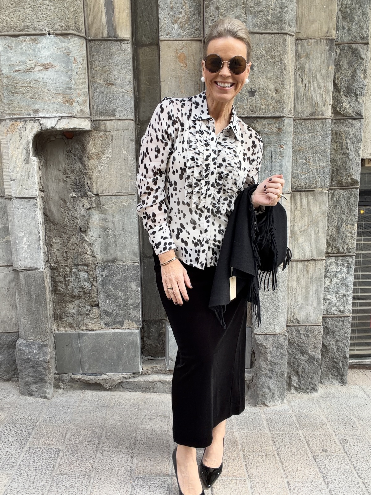 Vanora paita piristää kuosillaan. Culotes housut soveltuvat parempaan menoon. Mekko on siro kuin koru.