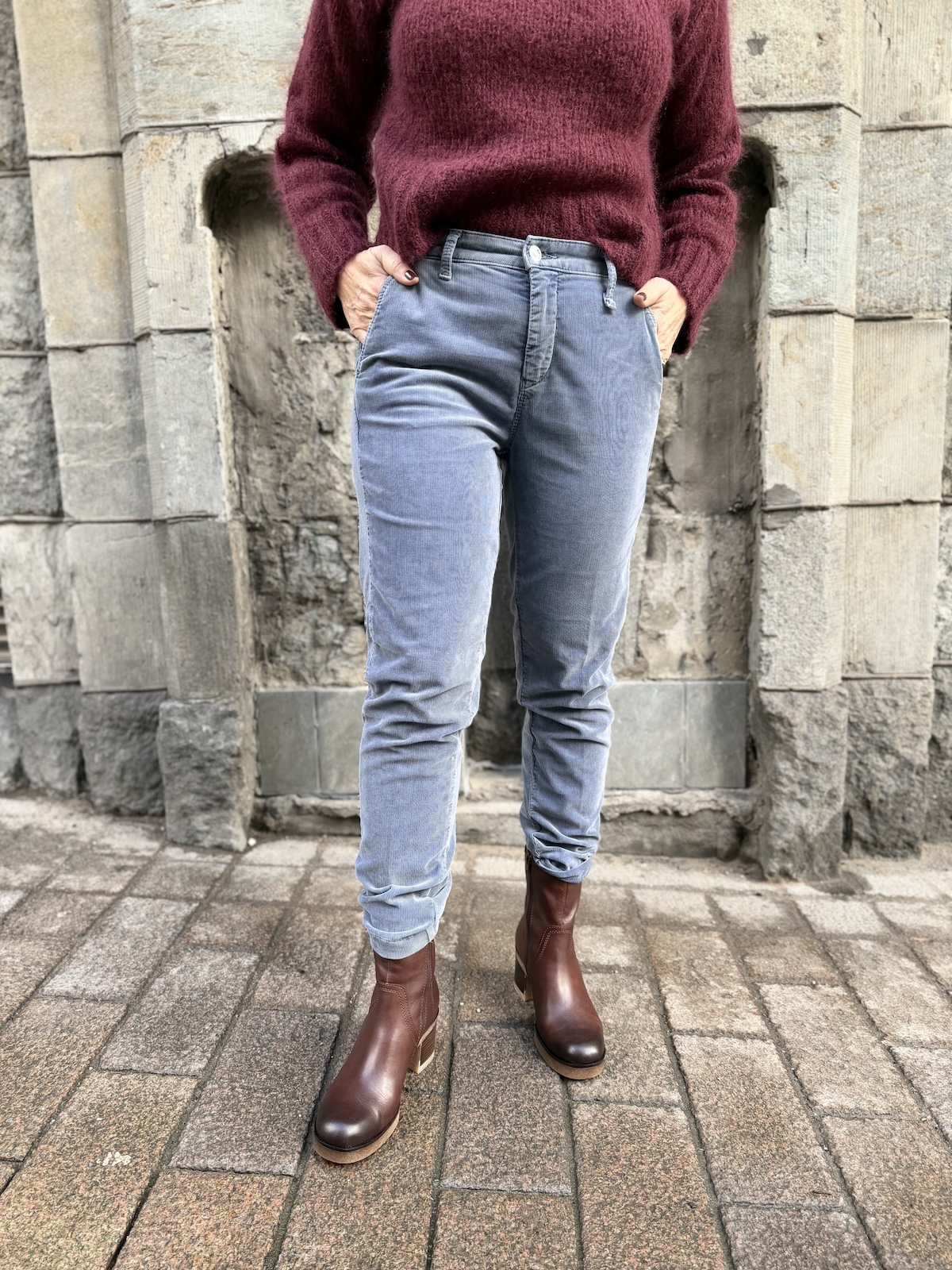 Burgyndy on loistava väri näiden sinisten samettihousujen kanssa! Katso meidän syksyn neuletarjoukset täältä.