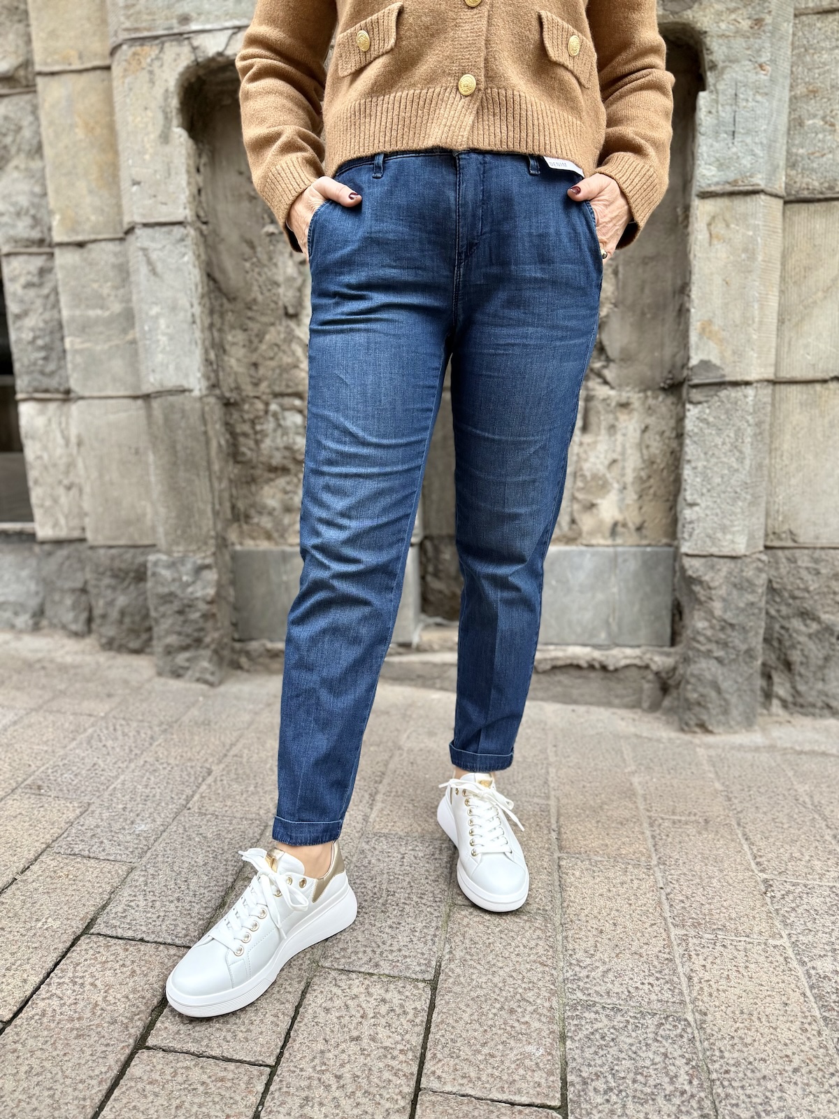 Chino farkut istuvat loistavasti ja ne ovat super pehmoista puuvilla/elastania. Chinot ylettyvät juuri navan päälle, ei vyötärön kapeimpaan kohtaan. Ne ovat istuvat lantiosta ja reisistä ja kapenevat alaspäin loppuen noin jalkapöydän päälle. Lahkeissa on parin sentin käänne, jonka voi myös avata. Minulla on farkuista päällä koko 34.