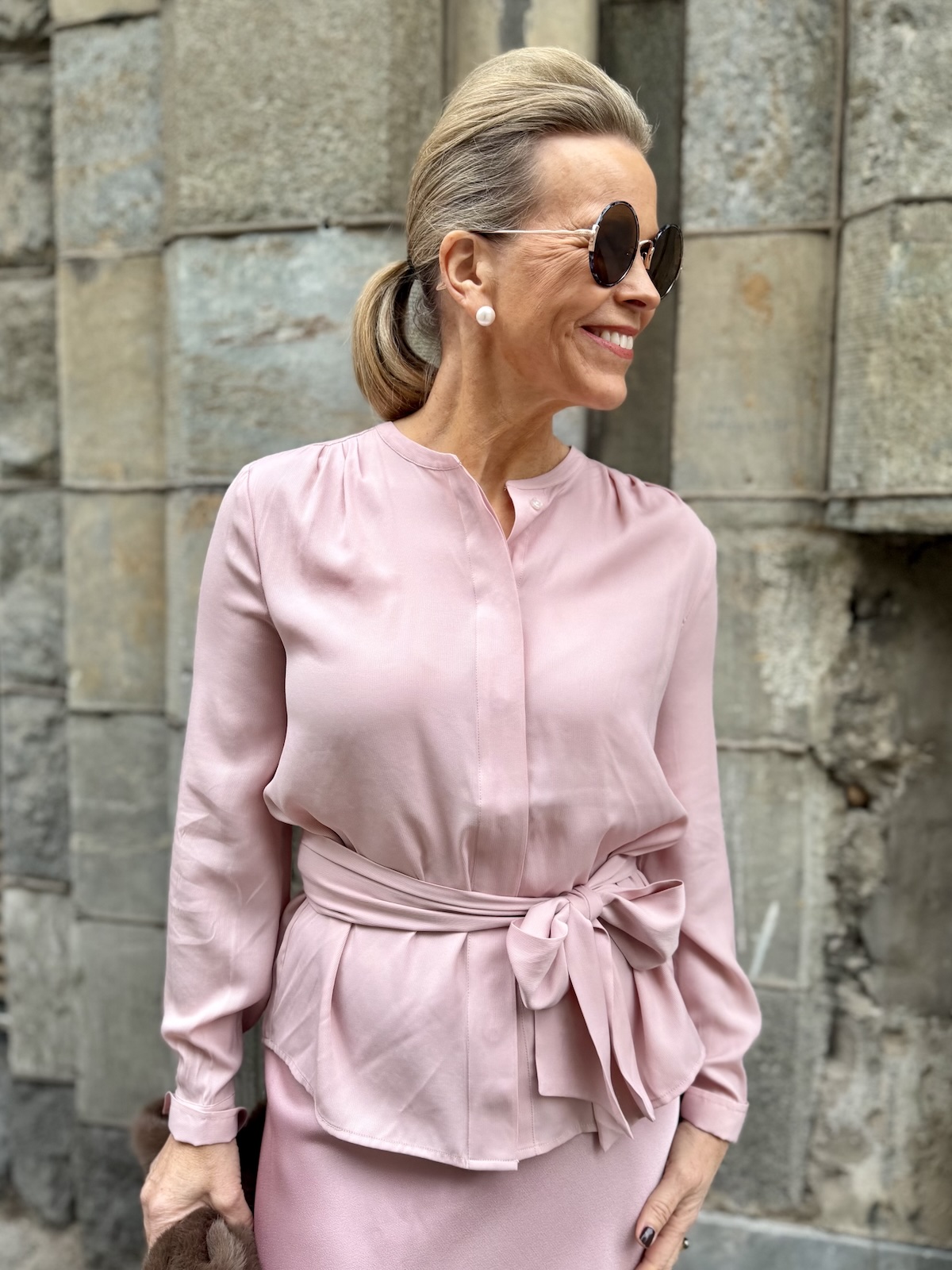 Gennifer paita on super kaunis ja väri täydellinen! Paidassa on O-kaula-aukko ja edessä on piilonapitus eli paidan saa kokonaan auki. Hihat ovat täyspitkät ja hihansuissa on rannekkeet napeilla. Malliltaan paita on suora ja se loppuu lantiolle. Paitaan kuuluu leveä nauha, jonka voi sitoa vyötärölle tai kaulaan useallakin eri tavalla. Minulla on paidasta päällä koko 34.