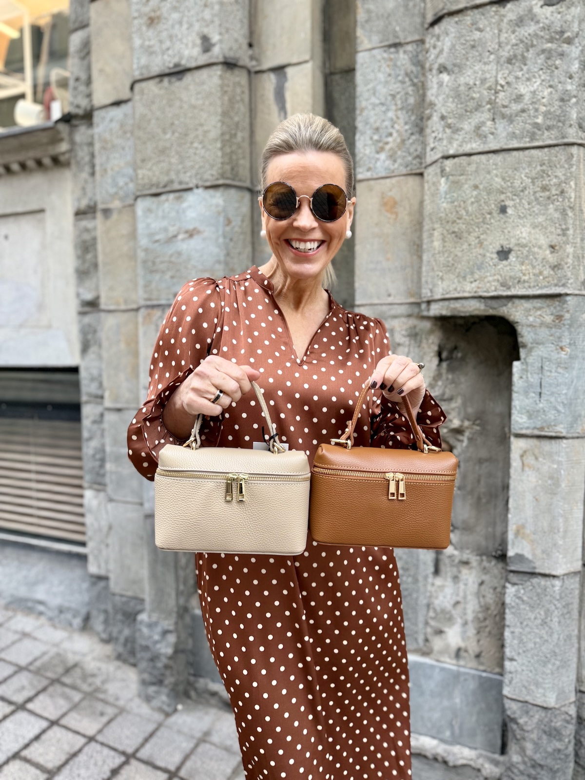 Konjakin värinen pallomekko tummemman laukun kanssa ja musta mekko vaalean laukun kera.