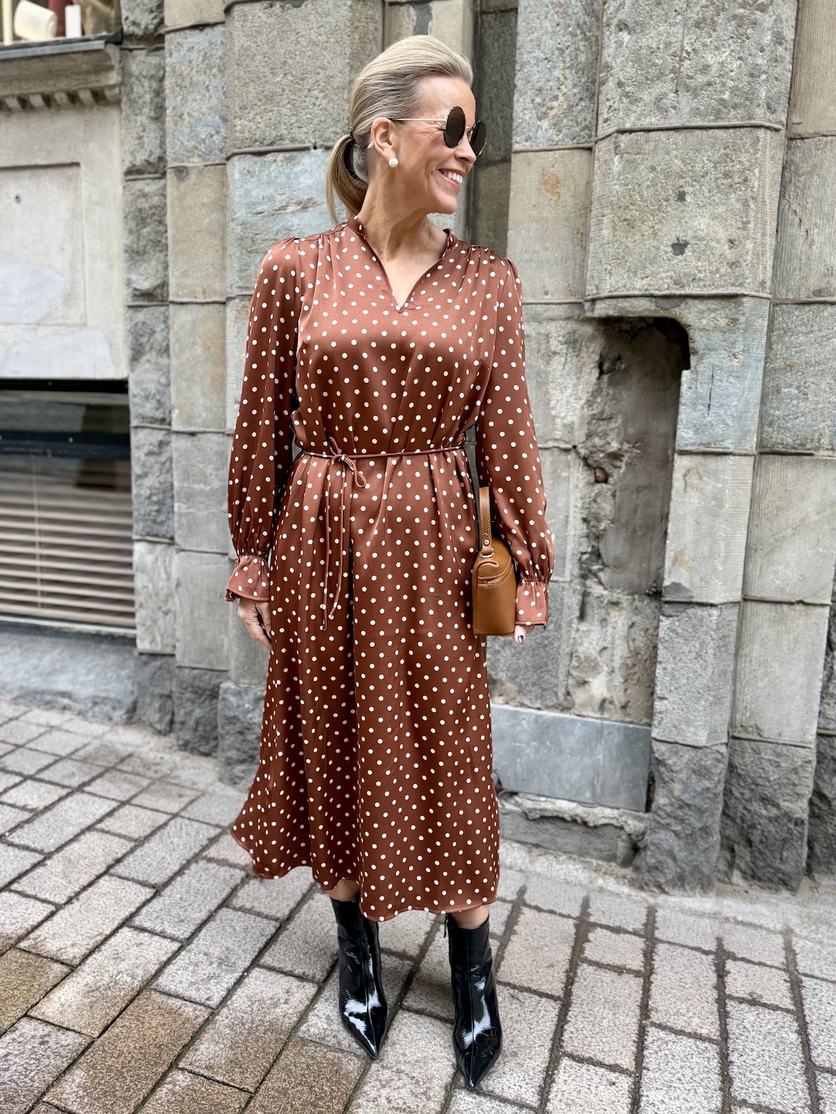 Konjakin värisessä pallomekossa on luonnonvaaleita palloja.