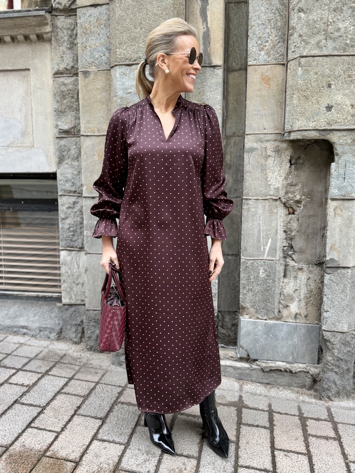 Pallomekko on aivan ihana mekko. Mekossa on hieman paksumpi ja ylellisen tuntuinen kangas. Mekossa on V-kaula-aukko, olkapäillä on pientä rypytystä ja hihat ovat täyspitkät. Hihansuissa on kuminauha ja pieni fyrrykantti. Malliltaan mekko on suorahko ja se laskeutuu kauniisti lähelle nilkkoja. Siihen kuuluu ohut naruvyö, jonka voi kietaista vyötärölle. Minulla on mekosta päällä koko 34. Mekko on reilua kokoa.