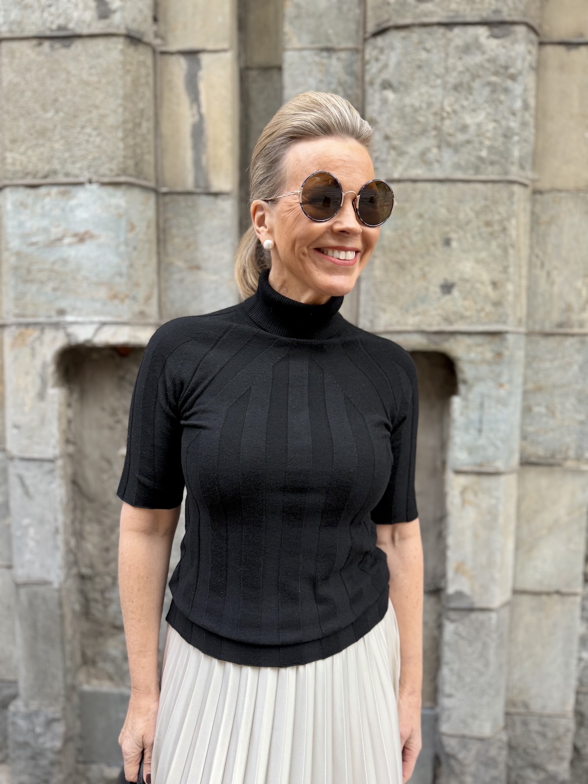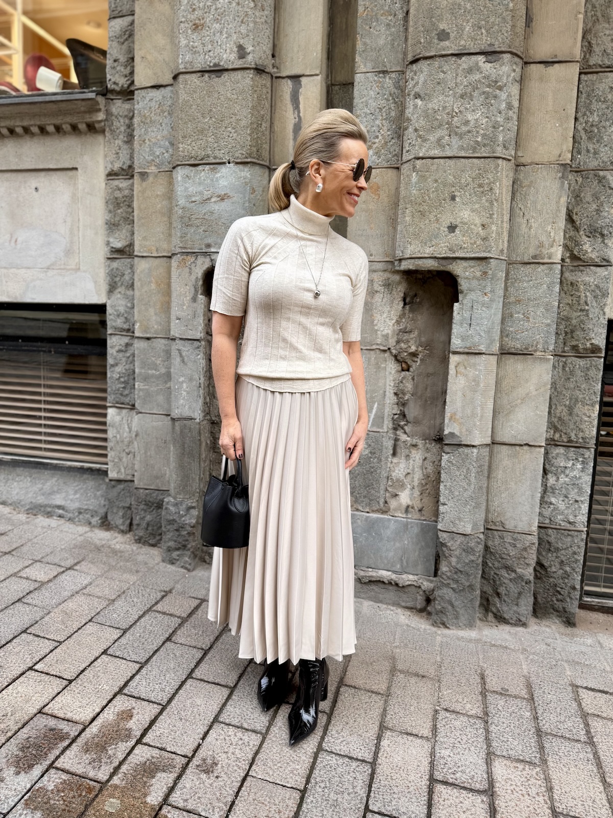 Yhdistin vaaleaan Veneda vekkihameeseen mustan yläosan. Tämä combo ja juuri näin päin ihastuttaa omaa silmääni. Pidän siitä, että kaikki muut asut ja asusteet ovat tummia ja alaosa on vaalea. Minusta se näyttää todella tyylikkäältä ja ihanan selkeältä, cleaniltä.