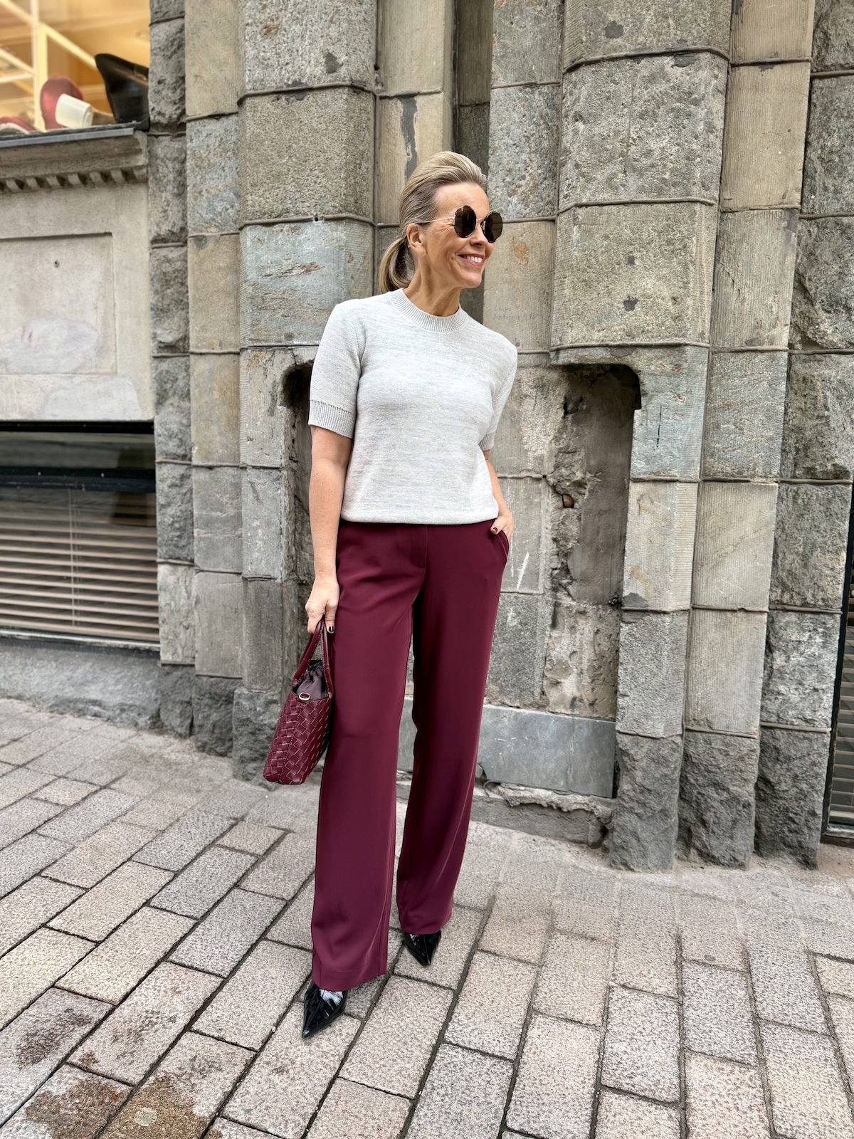 Yhdistin vaaleanharmaan neuleen Malto housuihin € 129,00