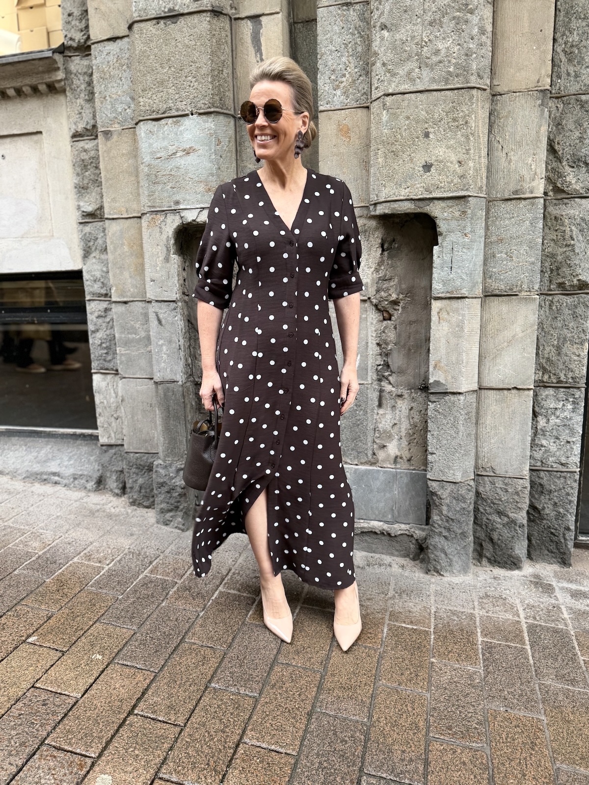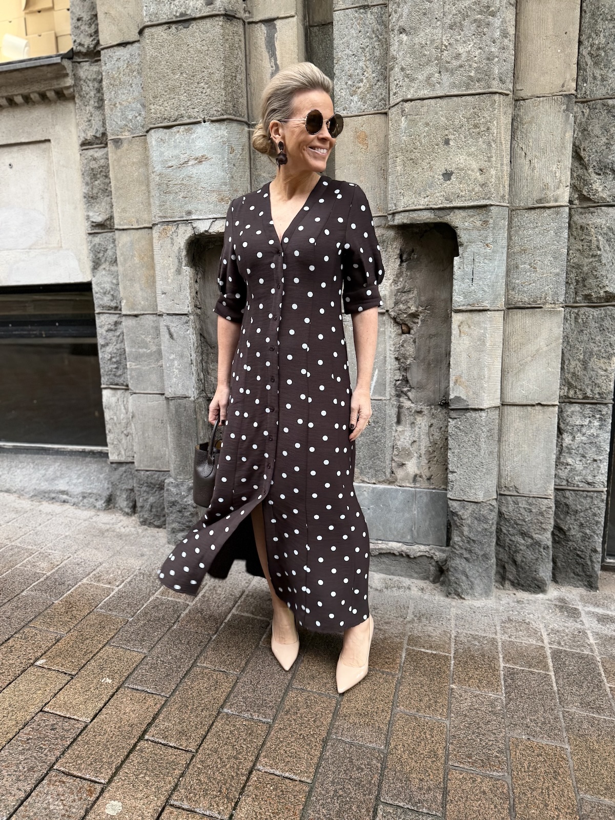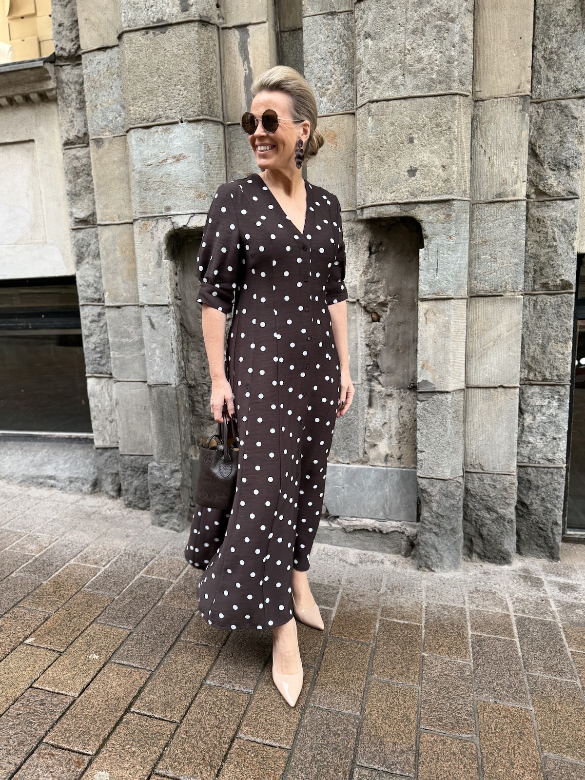Ihana pallokuviollinen mekko; tummanruskea valkoinen