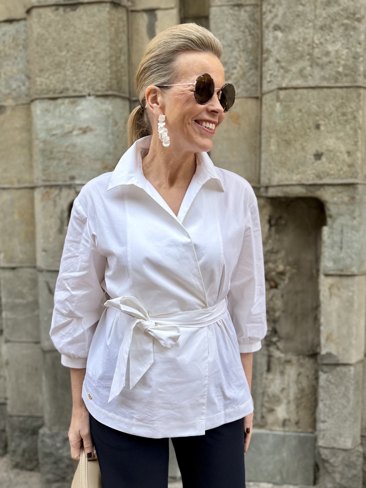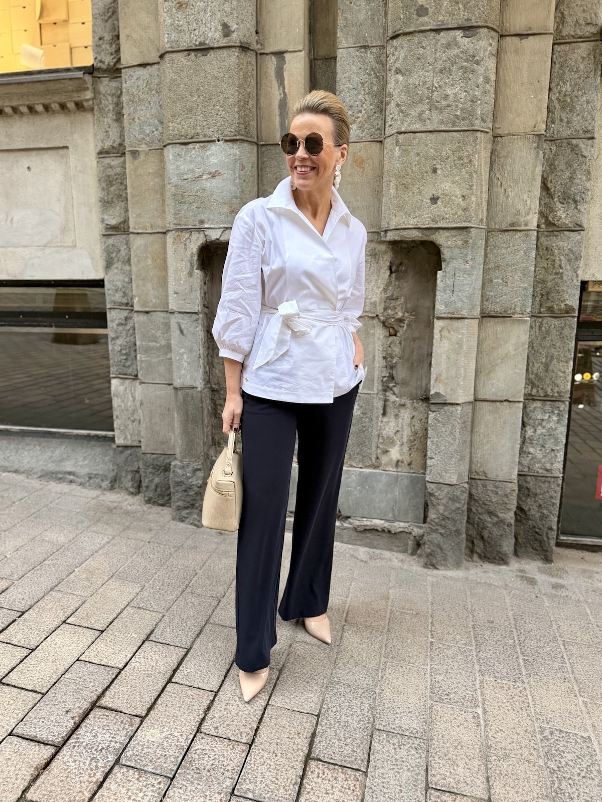 Mara paitapusero on tyylikäs, klassinen paitapusero. Paitapuserossa on kaulukset ja edessä on V-mallinen kaula-aukko. Paidan sivussa on nappi eli etuosa menee kiinni vasemman kyljen kohdalle. Paitapuseron vyö kietaistaan vyötärölle. Hihat ovat vajaamittaset ja hihansuissa on kantti. Sivuissa on pienet halkiot ja paitapusero ylettyy lantiolle. Paitapusero menee loistavasti kiinni edestä, se ei ole avonainen rinnan kohdalta. Paitapusero on malliltaan suora eli sen vyötärönkohtaa ei ole kavennettu. Minulla on paitapuserosta päällä koko 34. Paitapusero on reiluhkoa kokoa.