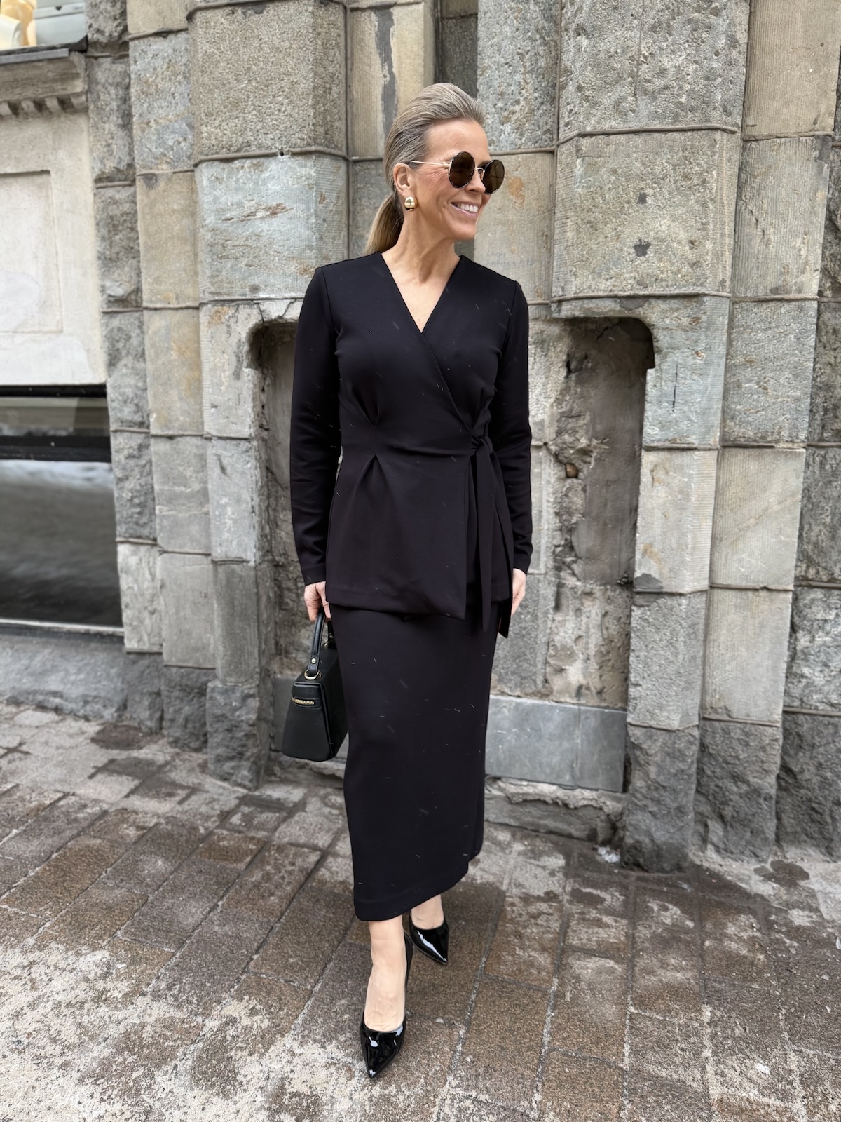 Aida midihameen kanssa kokonaisuudesta tulee kerrassaan tyylikäs. Videolla minulla on irtokaulus kietaisupaidan alla ja jalassa korkokenkien lisäksi myös tennarit. Toisin sanoen asu taipuu moneen.