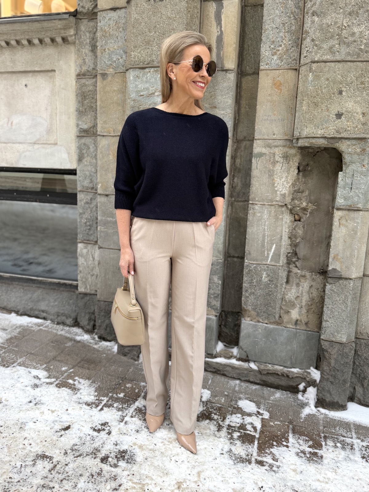 Minulla on jalassa todella kivat beiget meleratut housut. Housuissa on kuminauha vyötärö ja ne vain vetäistään jalkaan. Sivuissa on taskut ja lahkeet ovat suorat. Ne ovat juuri sopivan leveät moneen makuun 🙂
