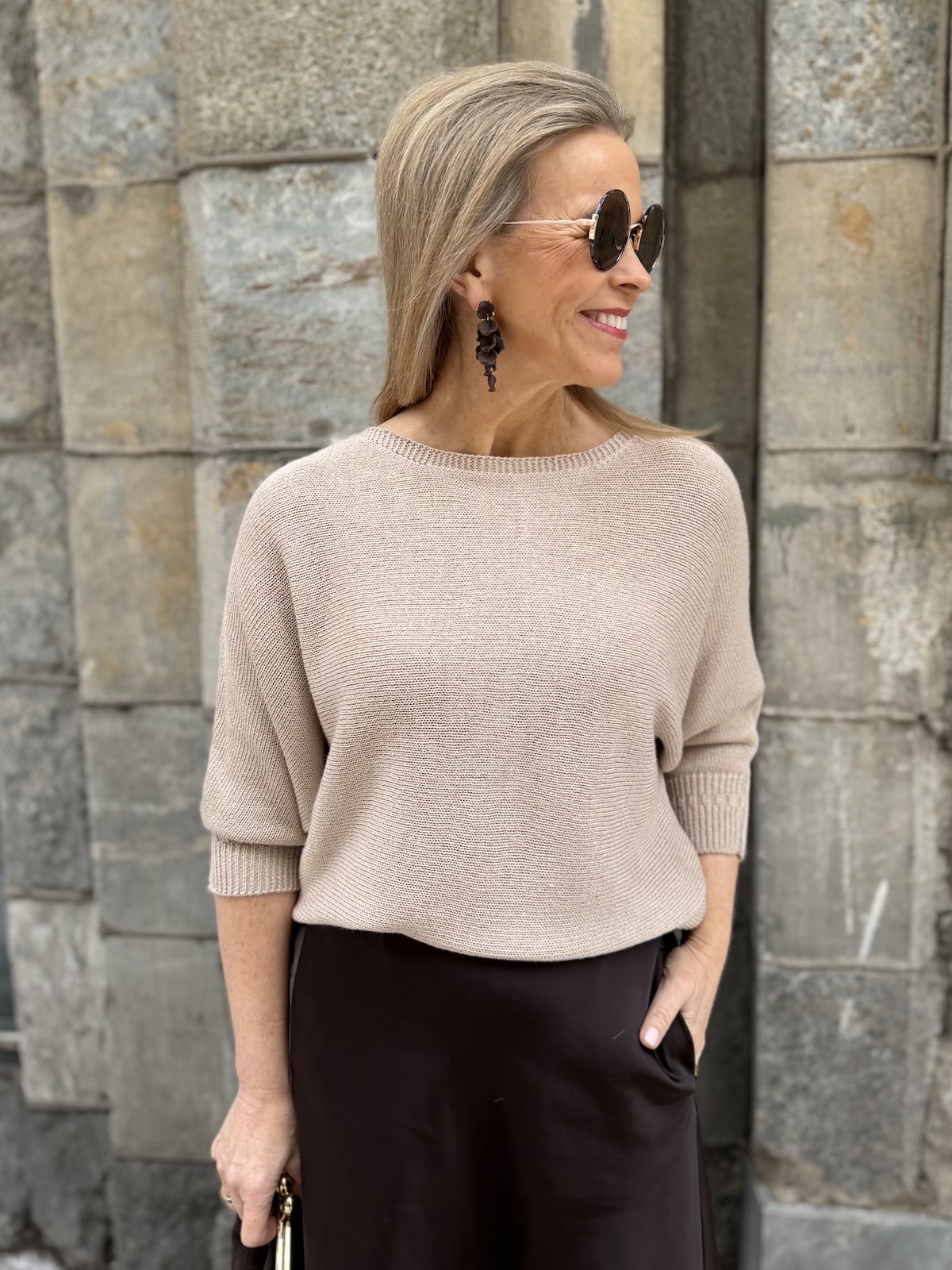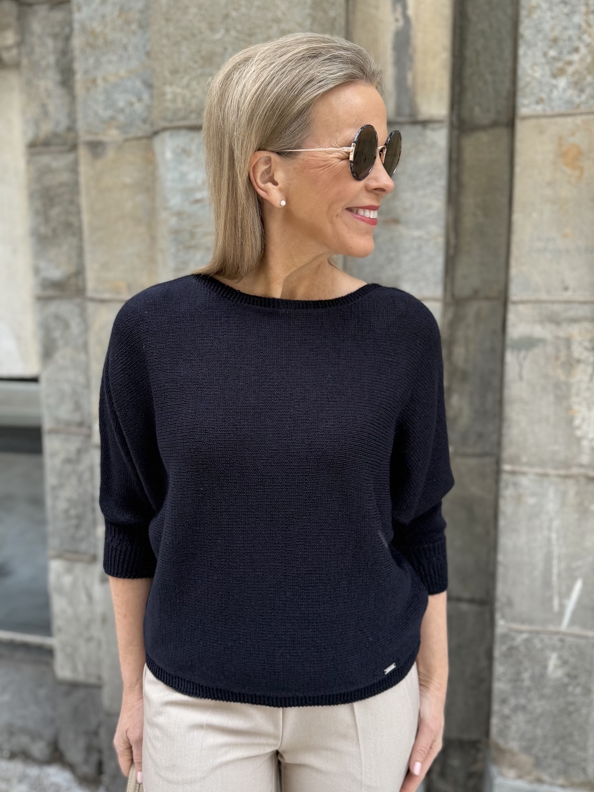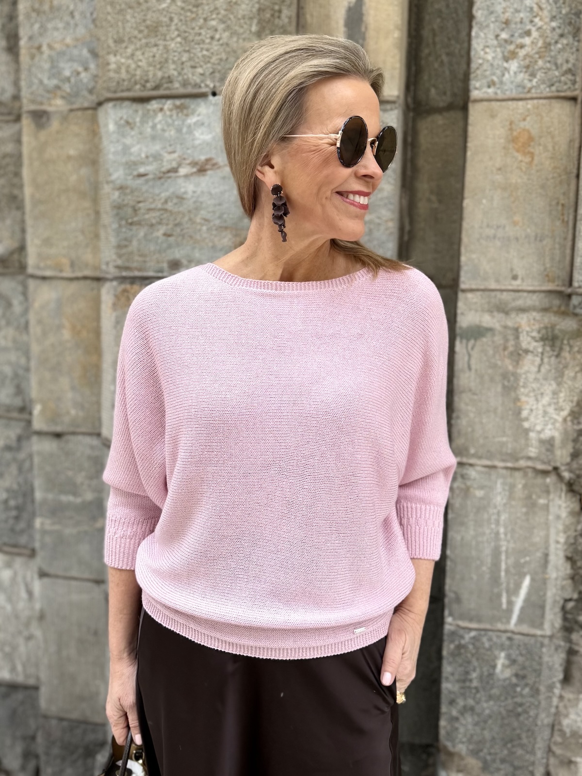 Dolman on kaunis lepakkohihainen neule, joka toimii arkeen mutta myös pieneen menoon kauniin aavistuksen kiiltäväpintaisen lookkinsa ansiosta. Neuleessa on O-kaula-aukko ja niskassa on halkio ja nappi. Hihat ovat vaajaamittaiset resorilla, ne ylettyvät kyynerpäiden alapuolelle. Neule kapenee alaspäin ja loppuu lantiolle. Minula on neuleesta päällä koko 34.