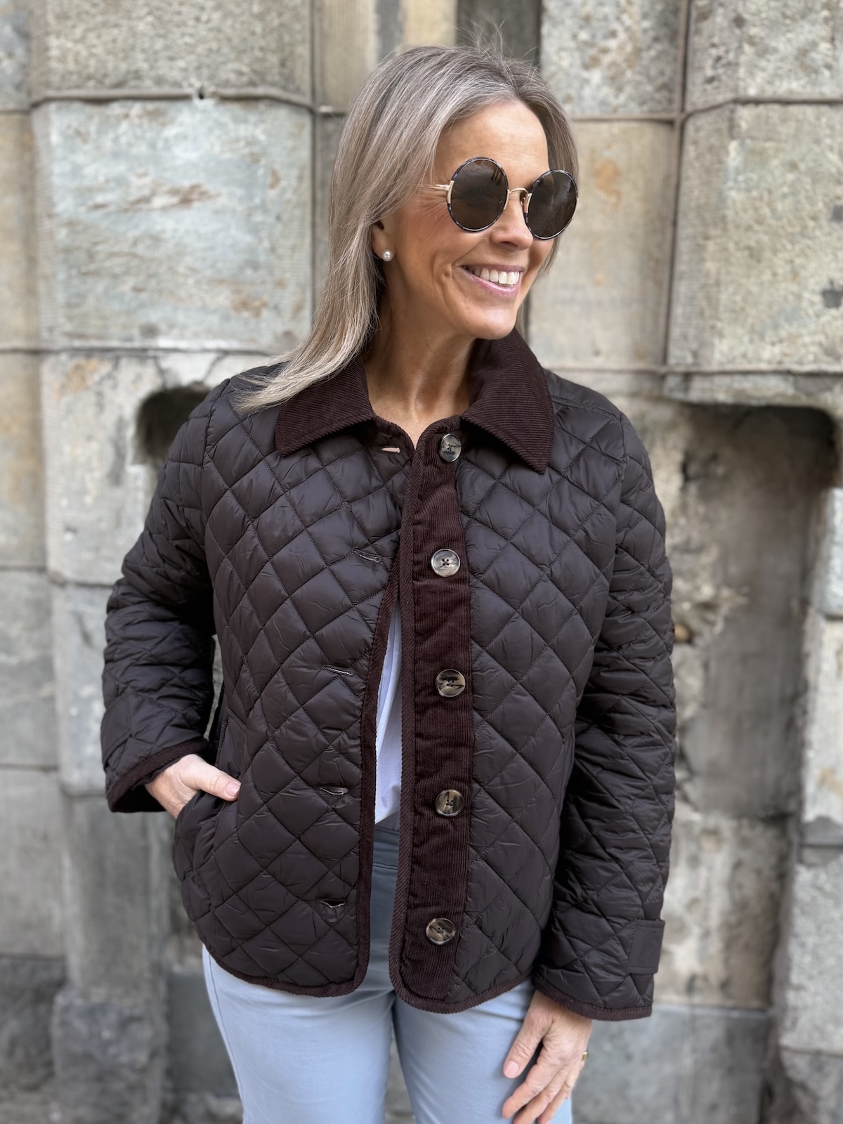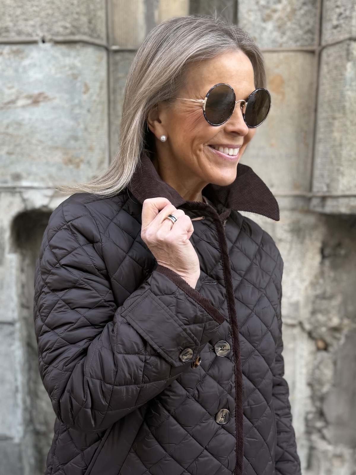 Safiya on tyylikäs, kauniisti työstetty ja ajaton tikkitakki. Takissa on klassinen salmiakki kuvio. Kaulukset ja nappilista ovat sävy sävyyn olevaa samettia. Takin helmaa ja hihansuita kiertää myös ohkaiset samettikantit. Edessä on isot napit ja sivuissa on viistotaskut. Hihansuissa on tampit. Malliltaan takki on suora ja se loppuu lantiolle. Minulla on takista päällä koko 34. Takki on yhden koon reilumpaa kuin normaalisti. Katso mitat. Rinnanympärykseen on hyvä jäädä noin 10 cm tilaa.