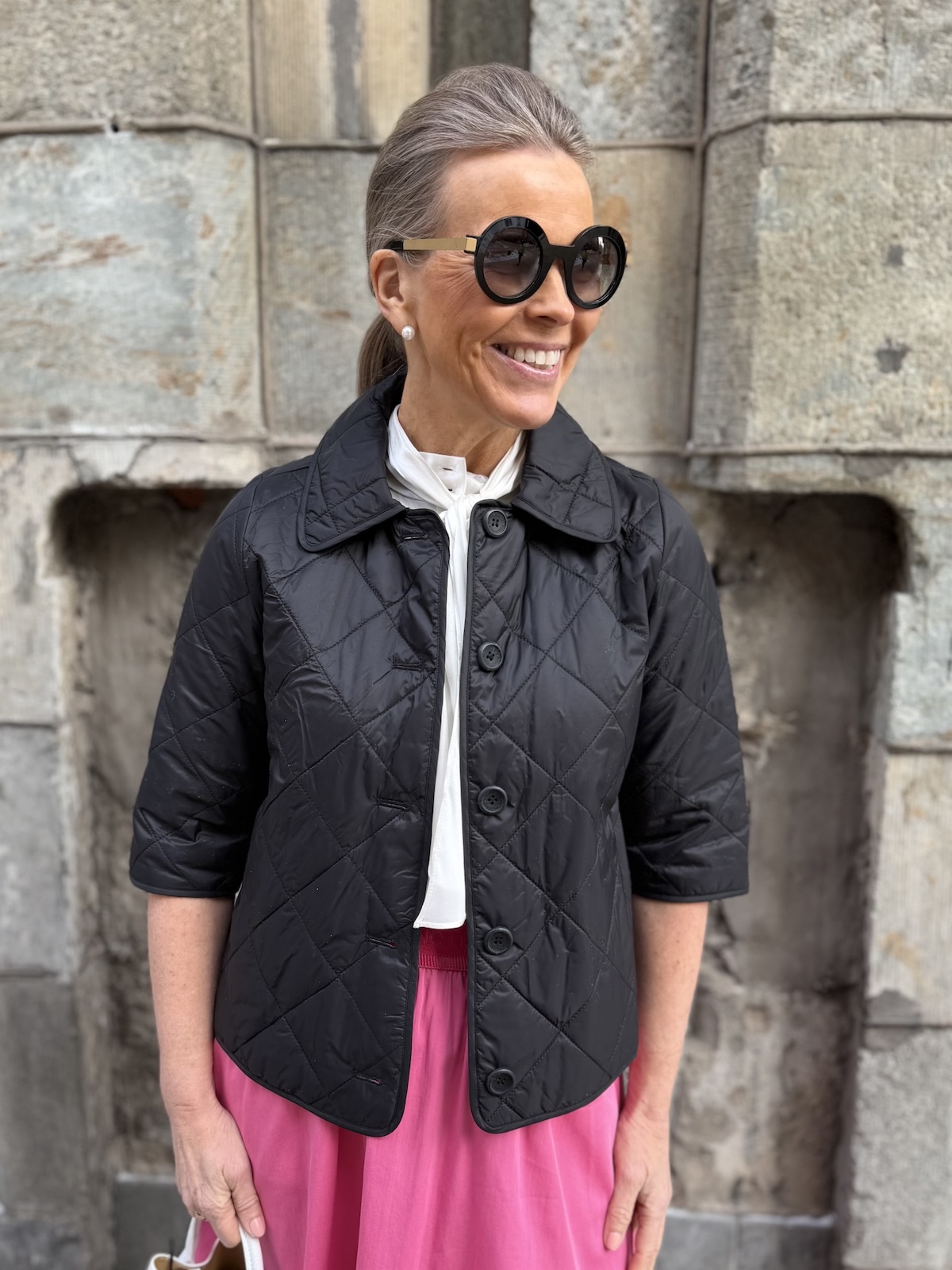 Tällainen ohut tikkijakku on TODELLA kätevä vaate. Kesällä toki jakku puetaan yksistään. Sitä voi käsitellä neuletakin tavoin eli kun sitä tarvitsee, vetää sen päällensä. Toiseksi se toimii talvella sisäjakkuna ja se puetaan trenssitakkien ja muiden kangastakkien tai villakangastakkien ALLE! Näin takeista saa lämpöisemmän version eli tämä on kerrassaan kätevää.